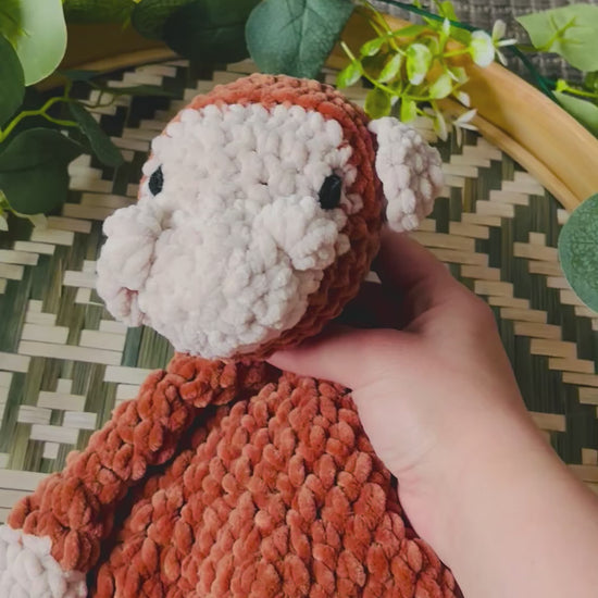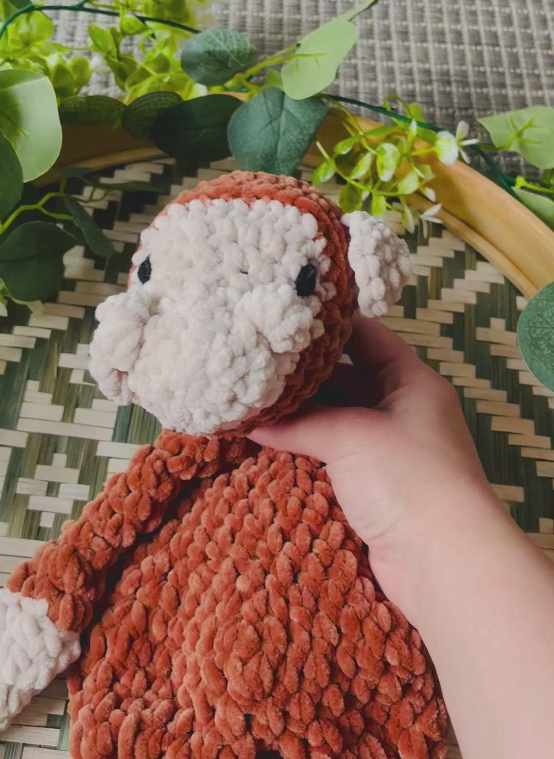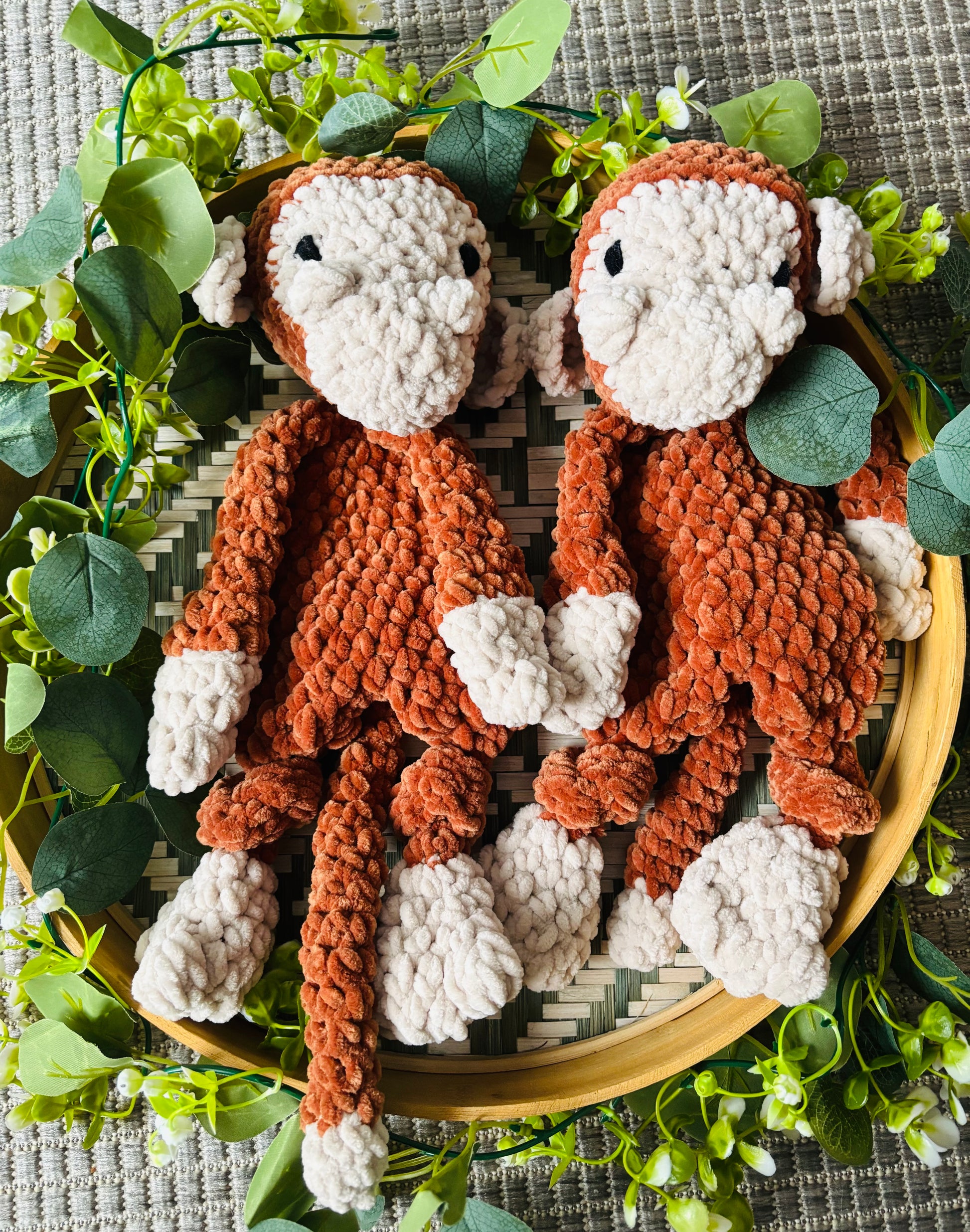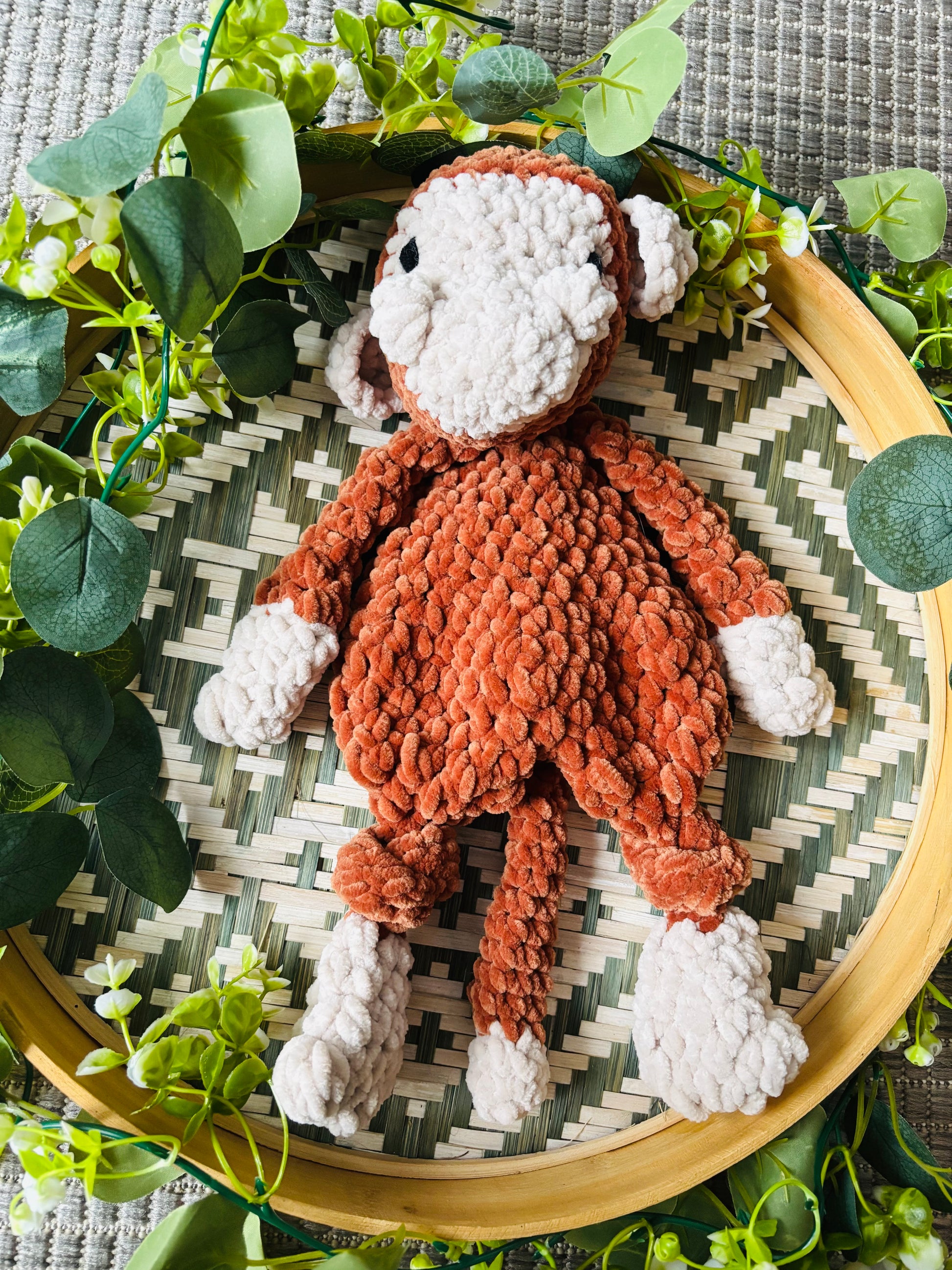 Pehmeästä samettilangasta virkattu vinksahtanut apina. Korvat tarkoituksella eri linjassa. Silmät kirjailtu. Turvallista antaa lapselle.