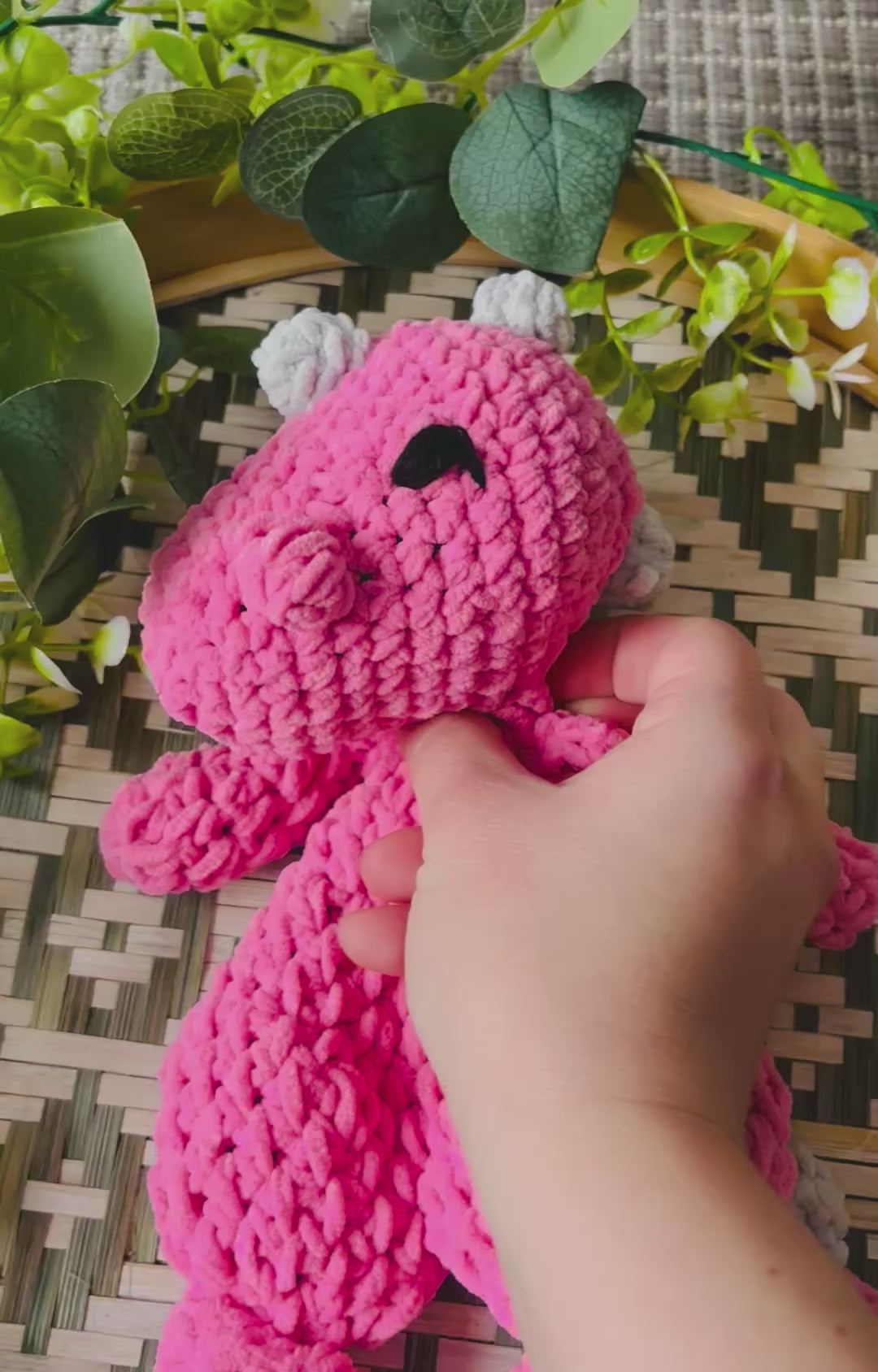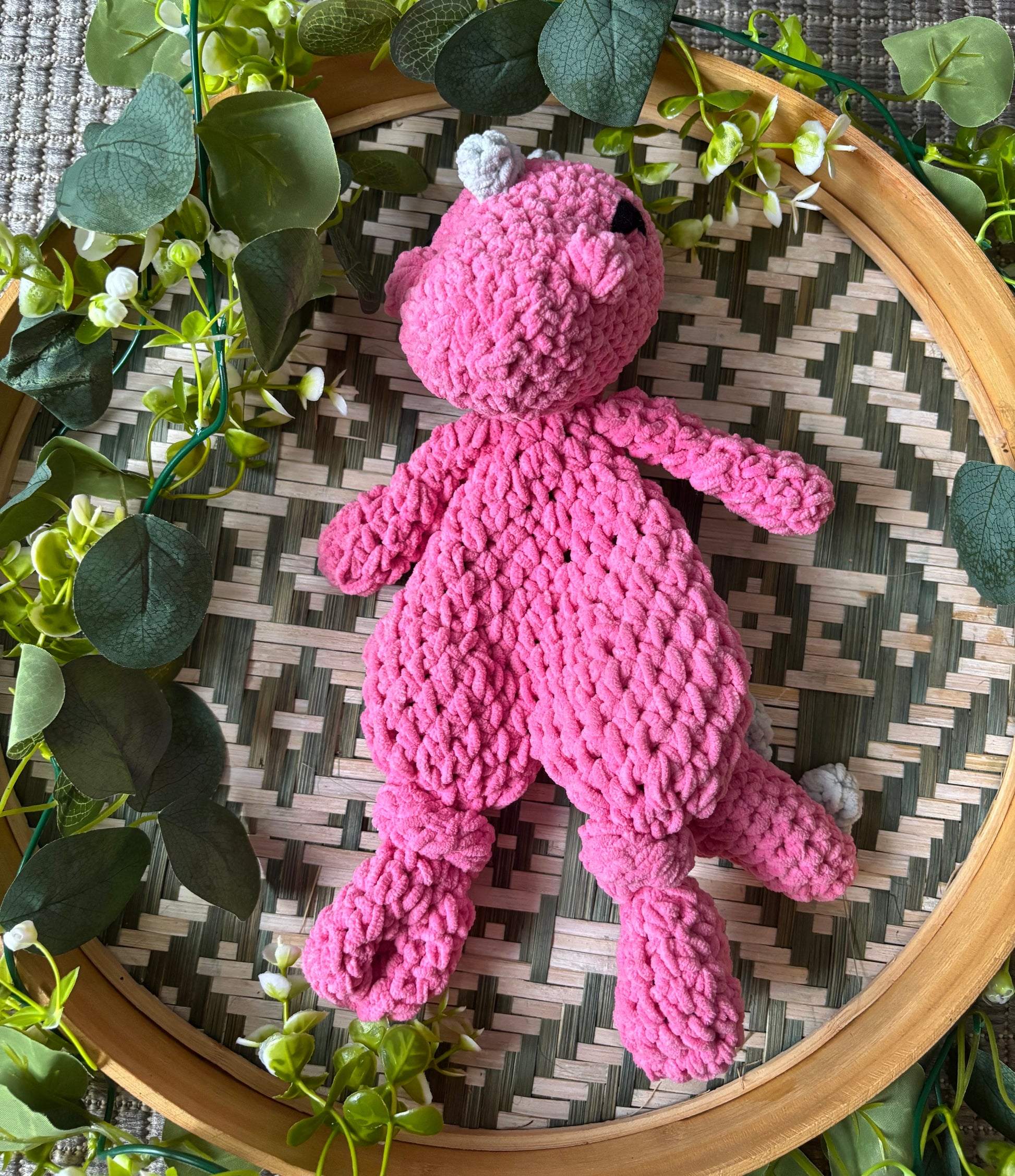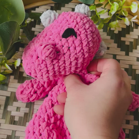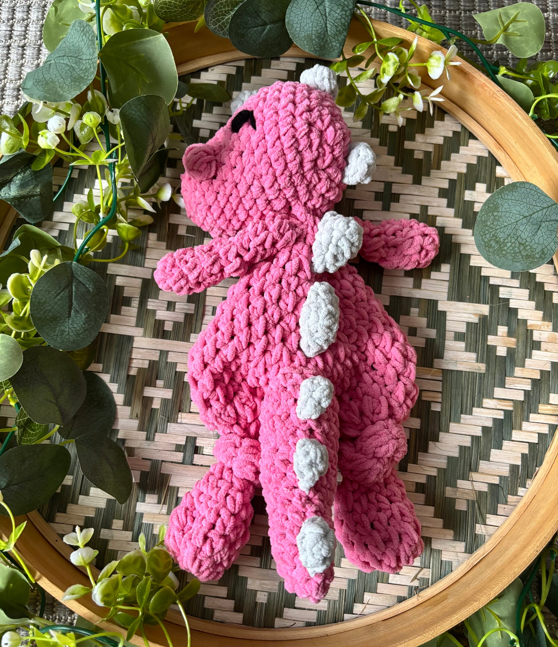 Samettilangasta virkattu pehmeä dinosaurus. Silmät kirjailtu ja on turvallista antaa lapselle.
