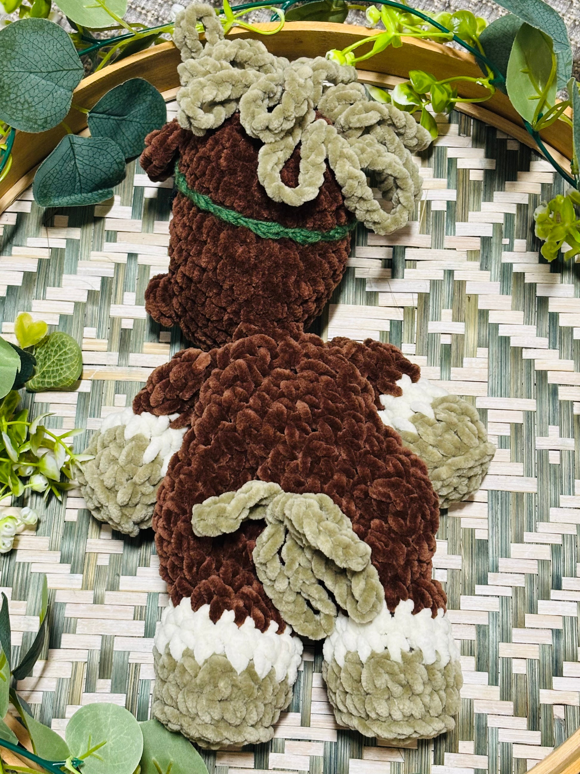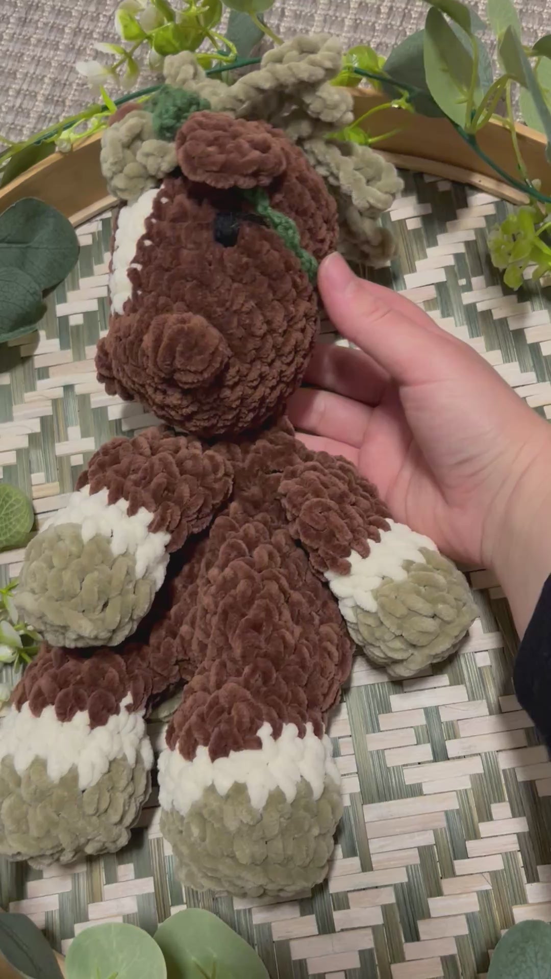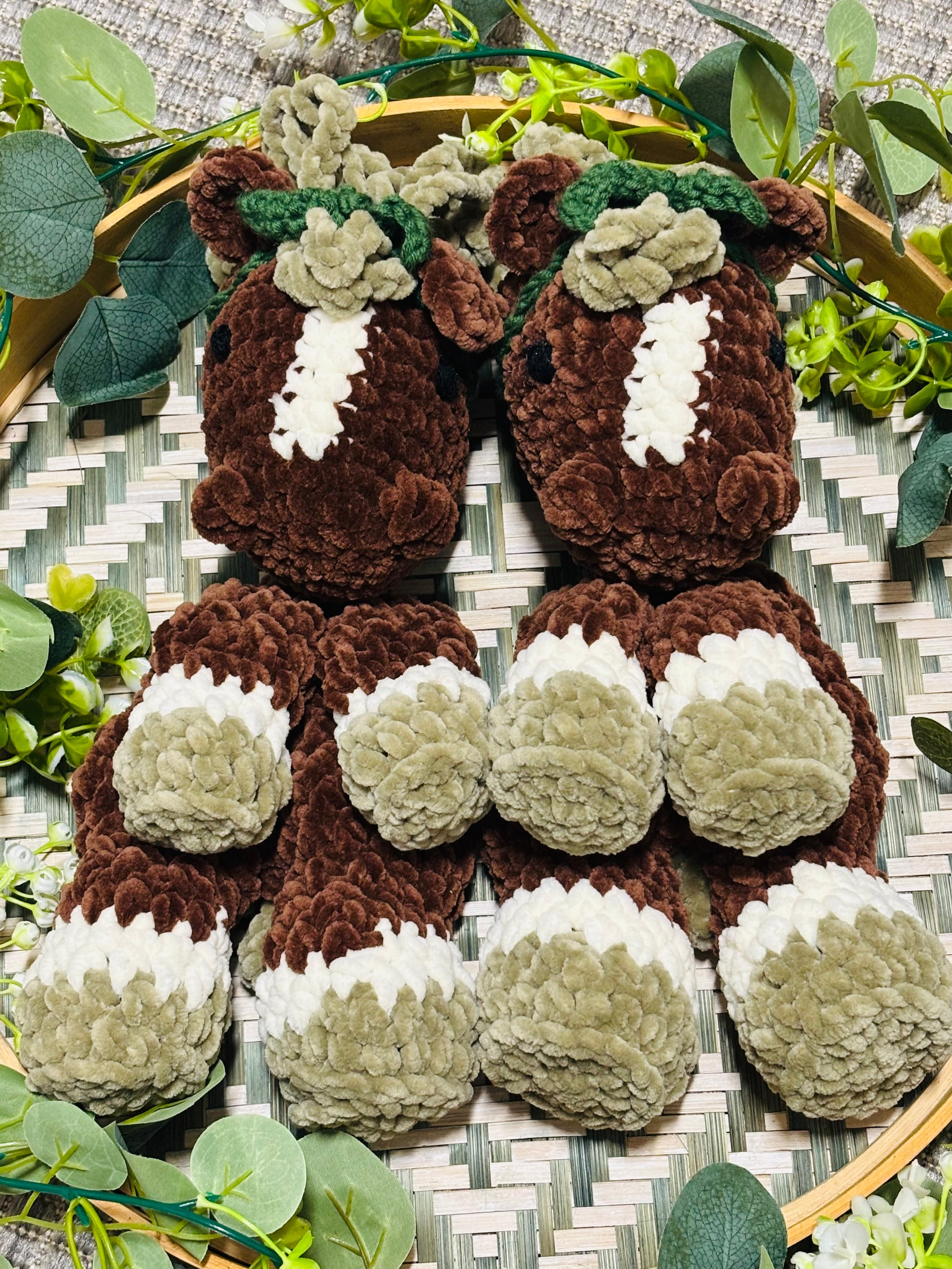 Samettilangasta virkattu pehmeä hevonen. Silmät kirjailtu ja on turvallista antaa lapselle. Hevosen päässä solmittava vihreä panta.