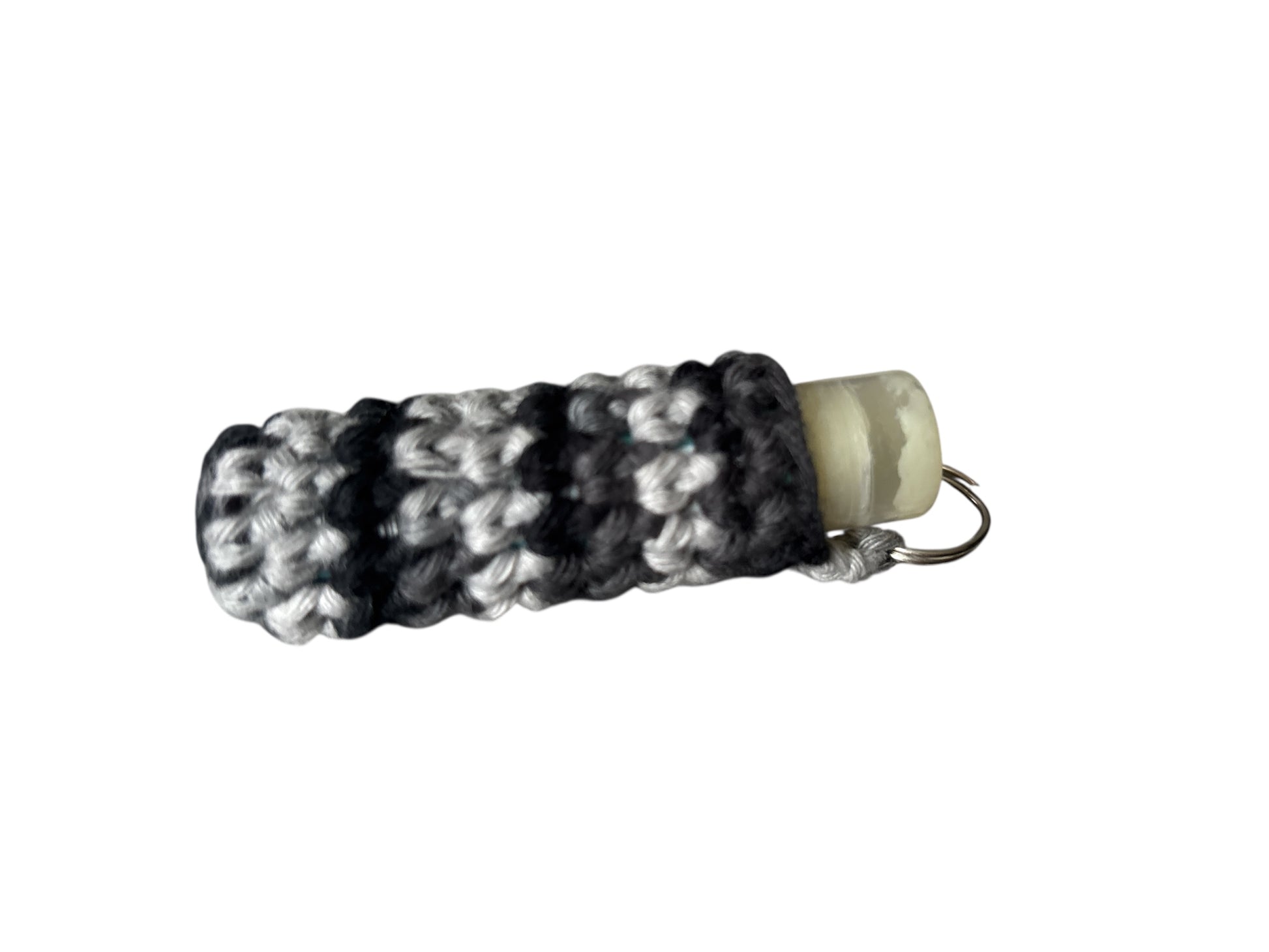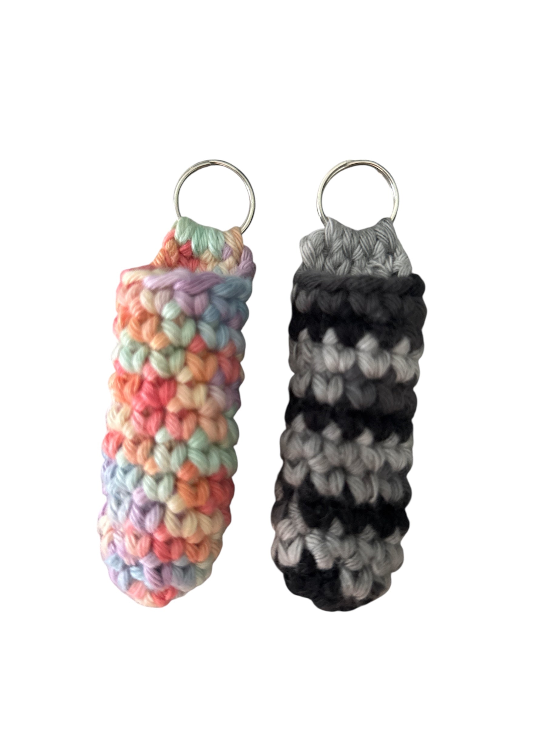 100% puuvillalangalla virkattu kätevä huulirasvan pidike. Hopeinen lenkki, josta pidikkeen saa esimerkiksi avaimiin tai laukkuun kiinni.