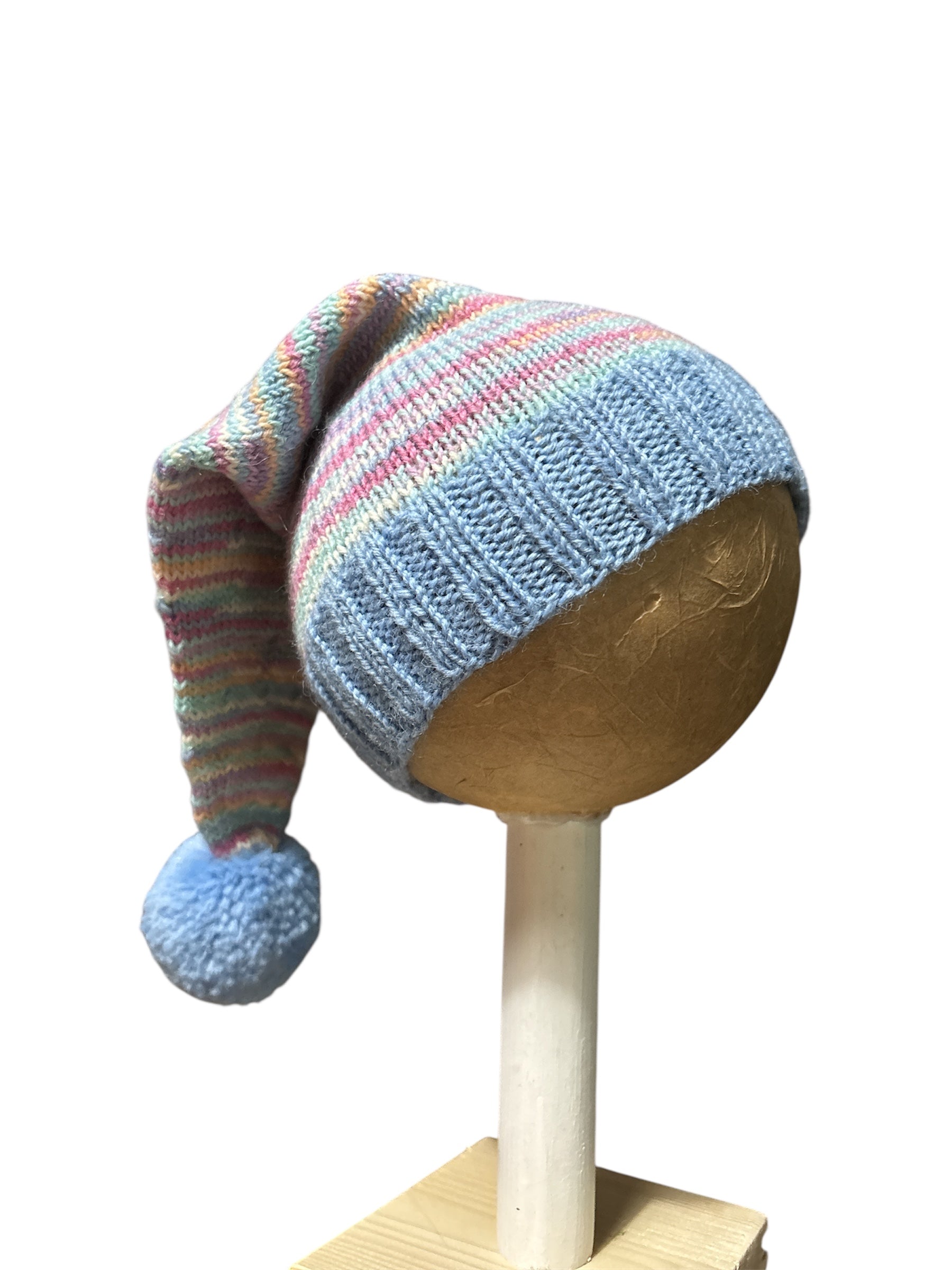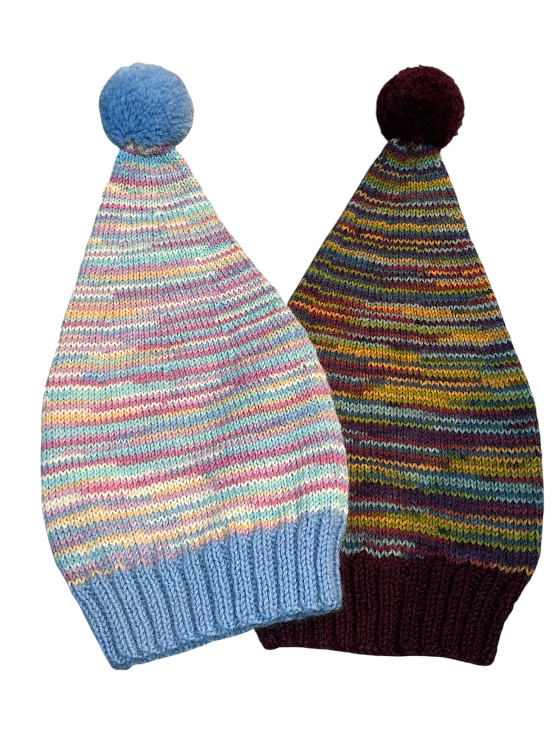 Kirjavat tonttulakit. Ohuemmasta Nalle langasta neulotut. 75% villa 25% polyamidi.