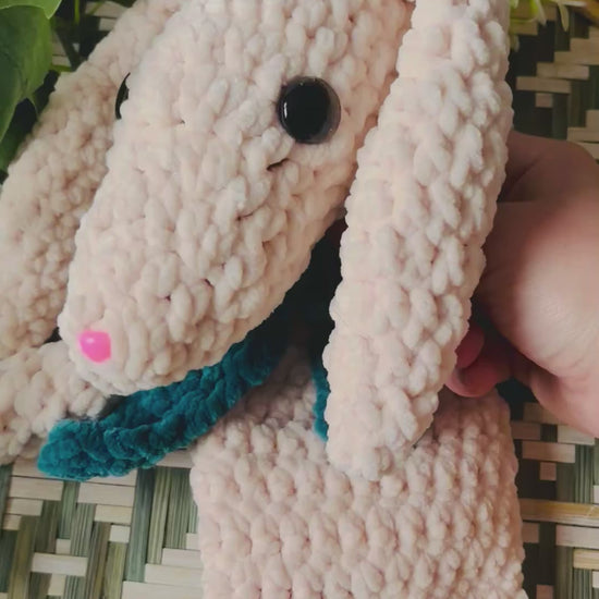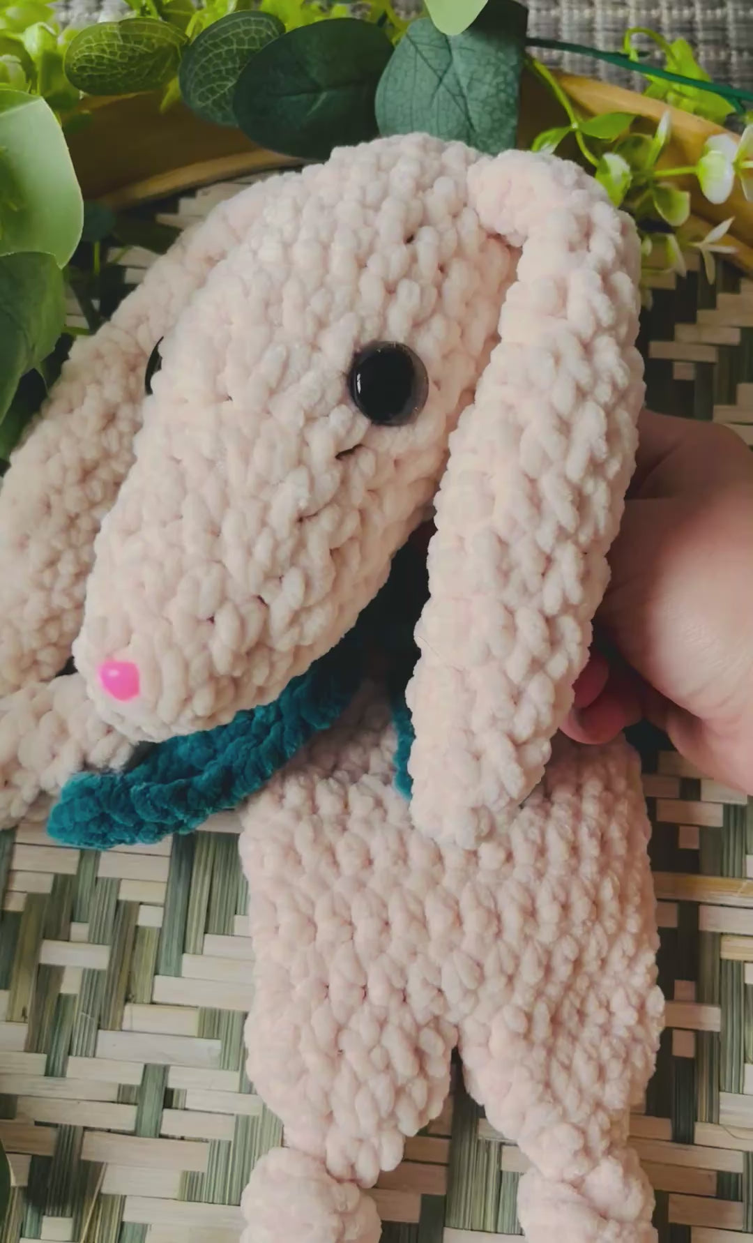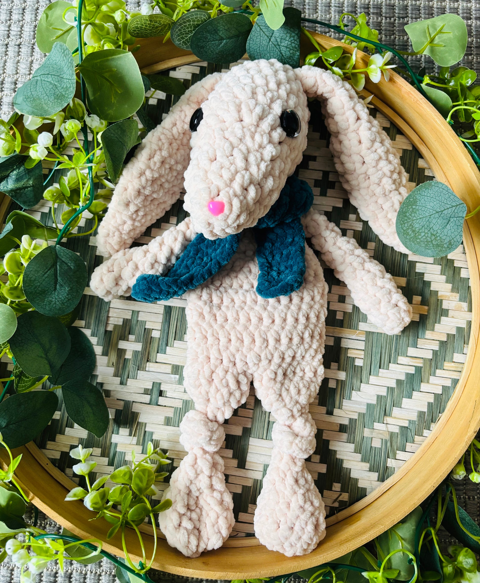 Samettilangasta virkattu pehmeä luppakorvainen koira. Turvasilmien vuoksi ei alle 3 vuotiaille. Irrotettava kaulahuivi.
