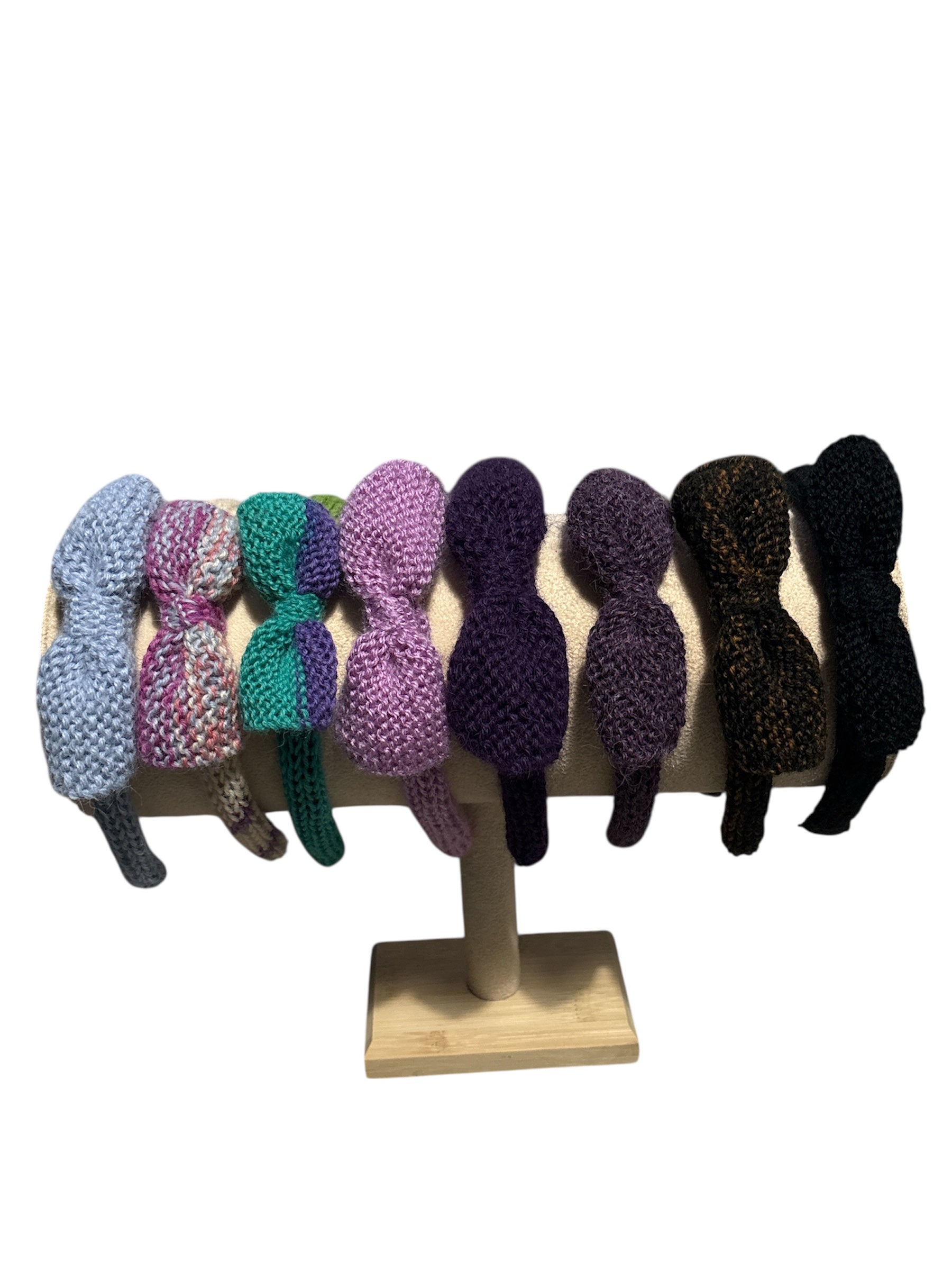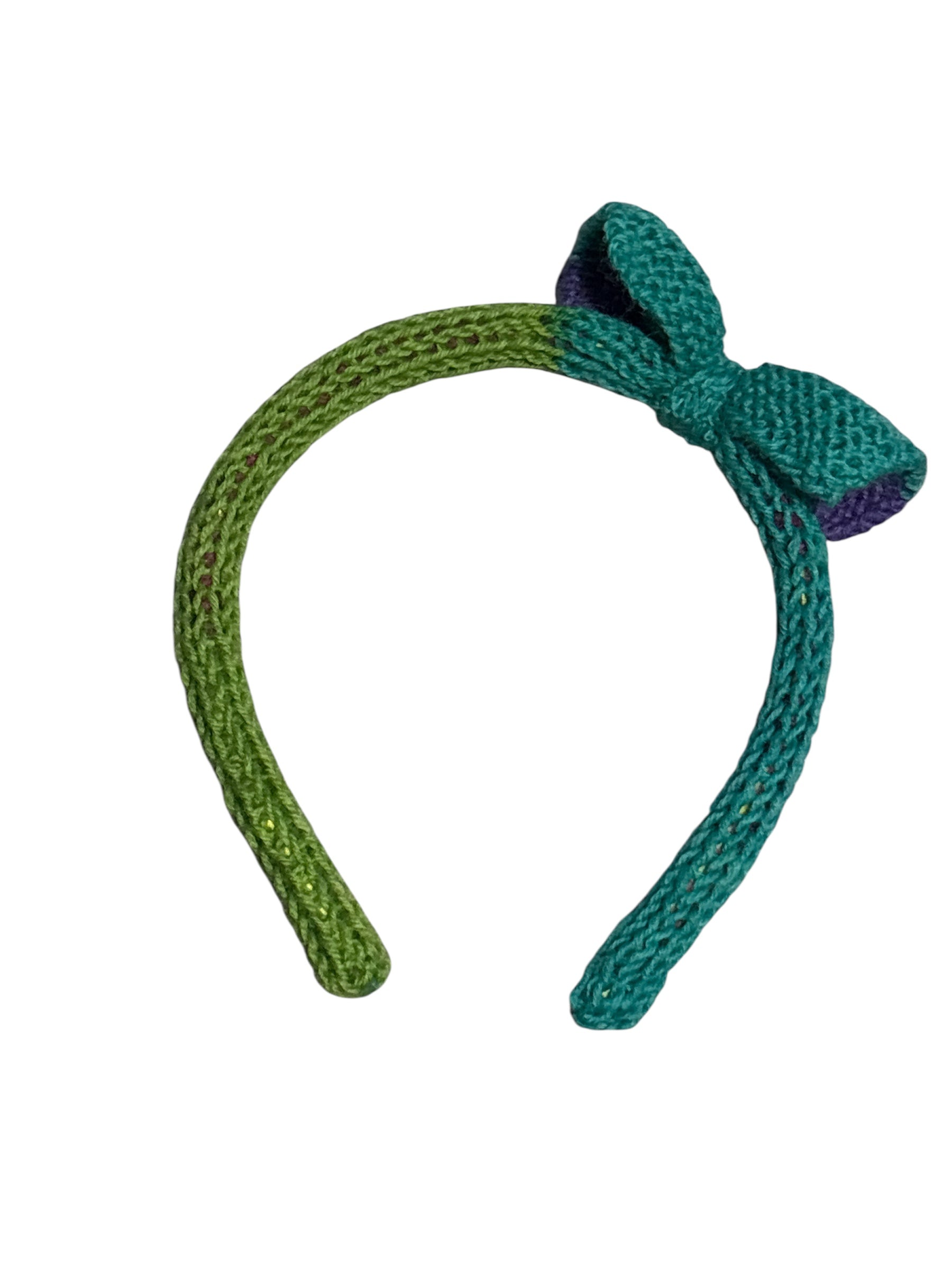 Kiristämätön malli. Rusetti asettuu söpösti pannan sivuun. Neulottu.
