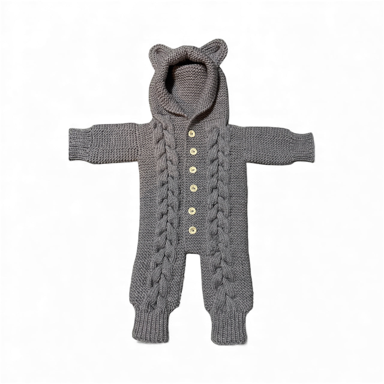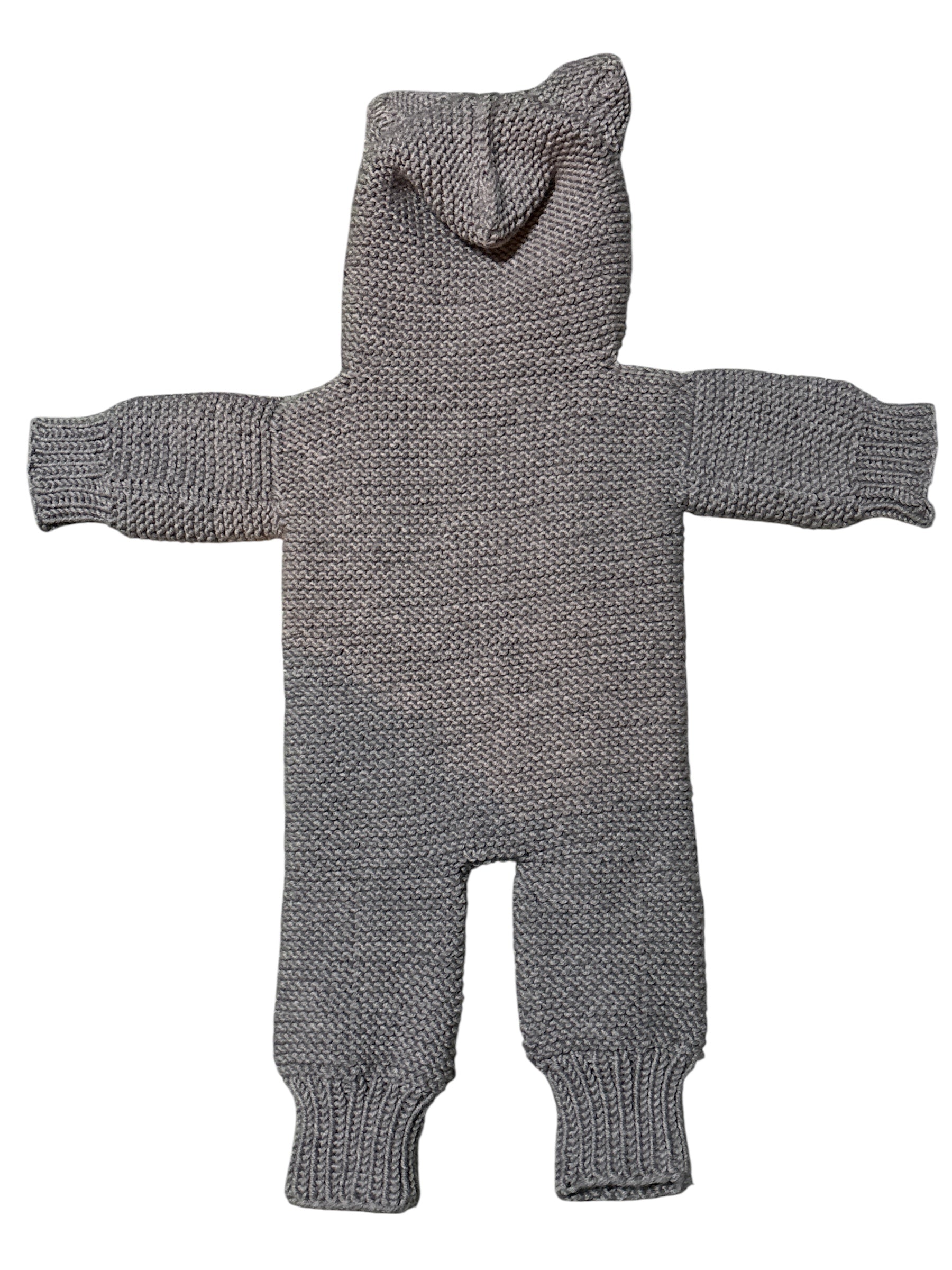 Söpö 100% merinovillasta neulottu haalari puunapeilla. Harmaa joka taittaa vähän violettiin.