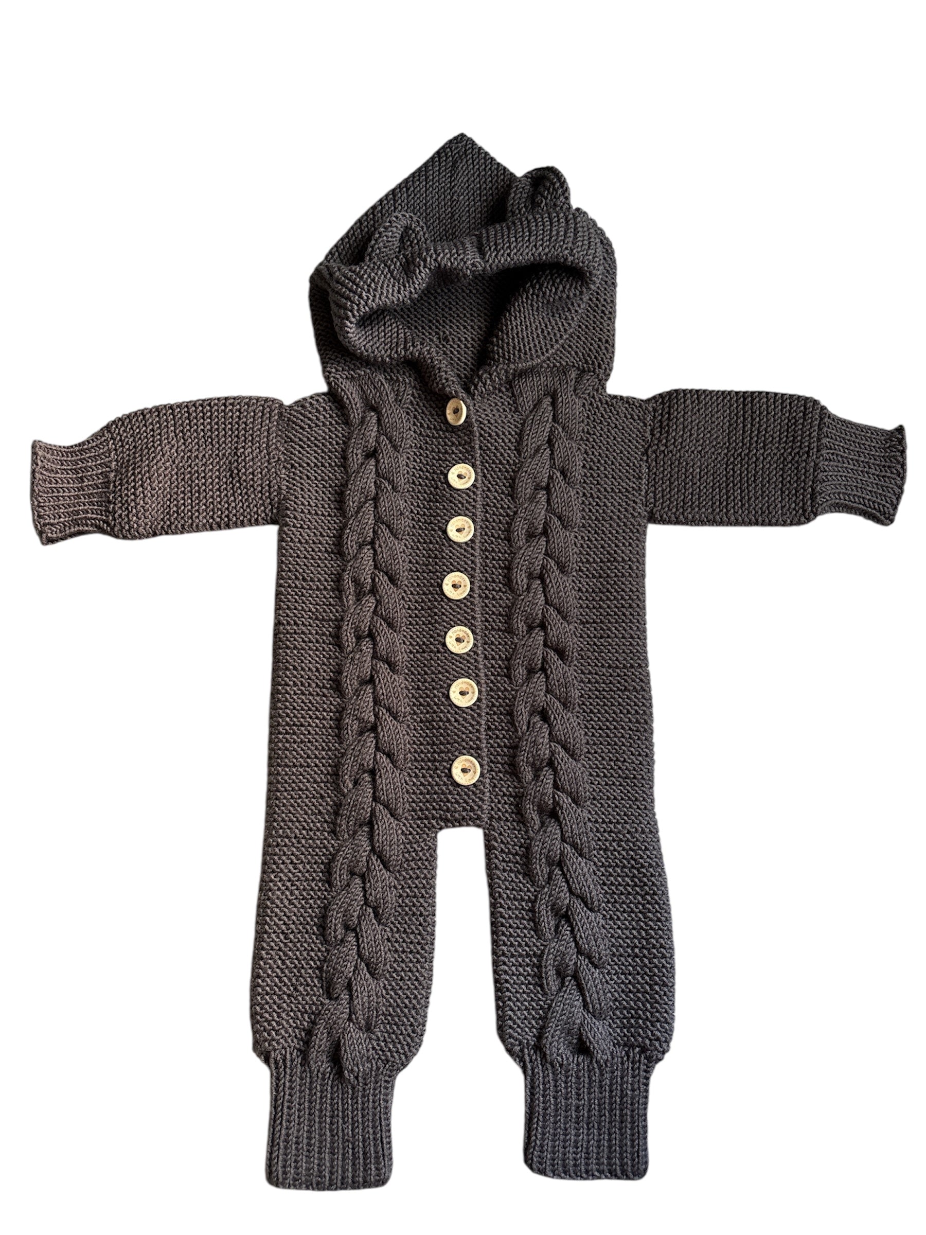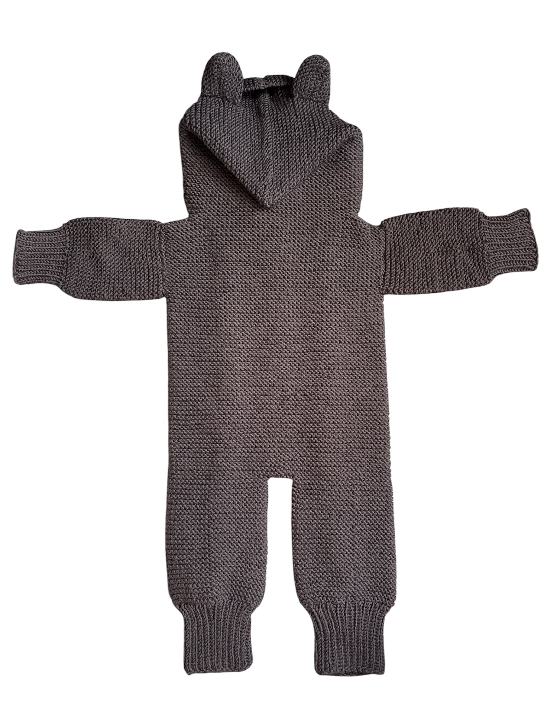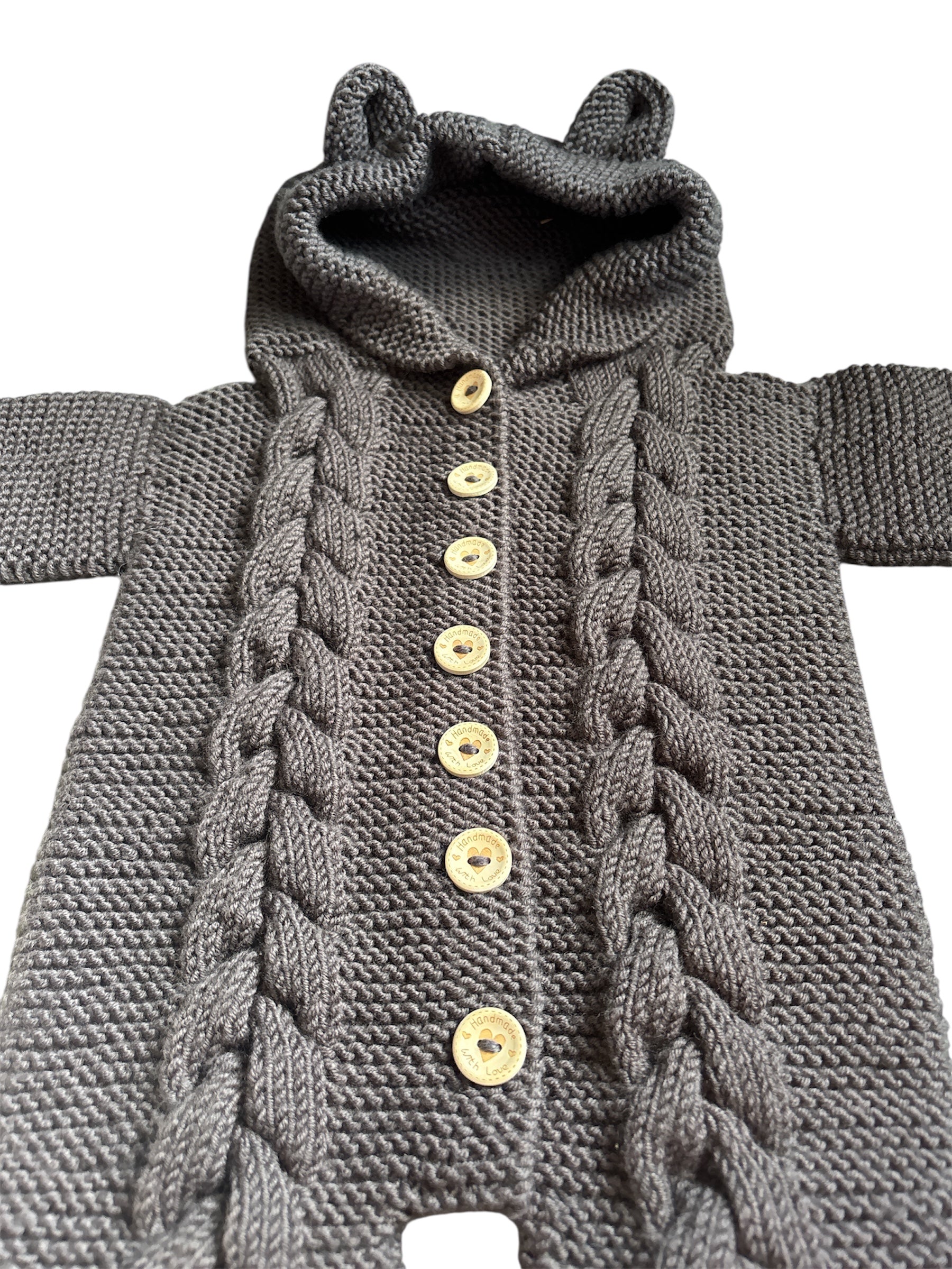 Söpö 100% merinovillasta neulottu haalari karhun korvilla. Ruskean sävyinen.
