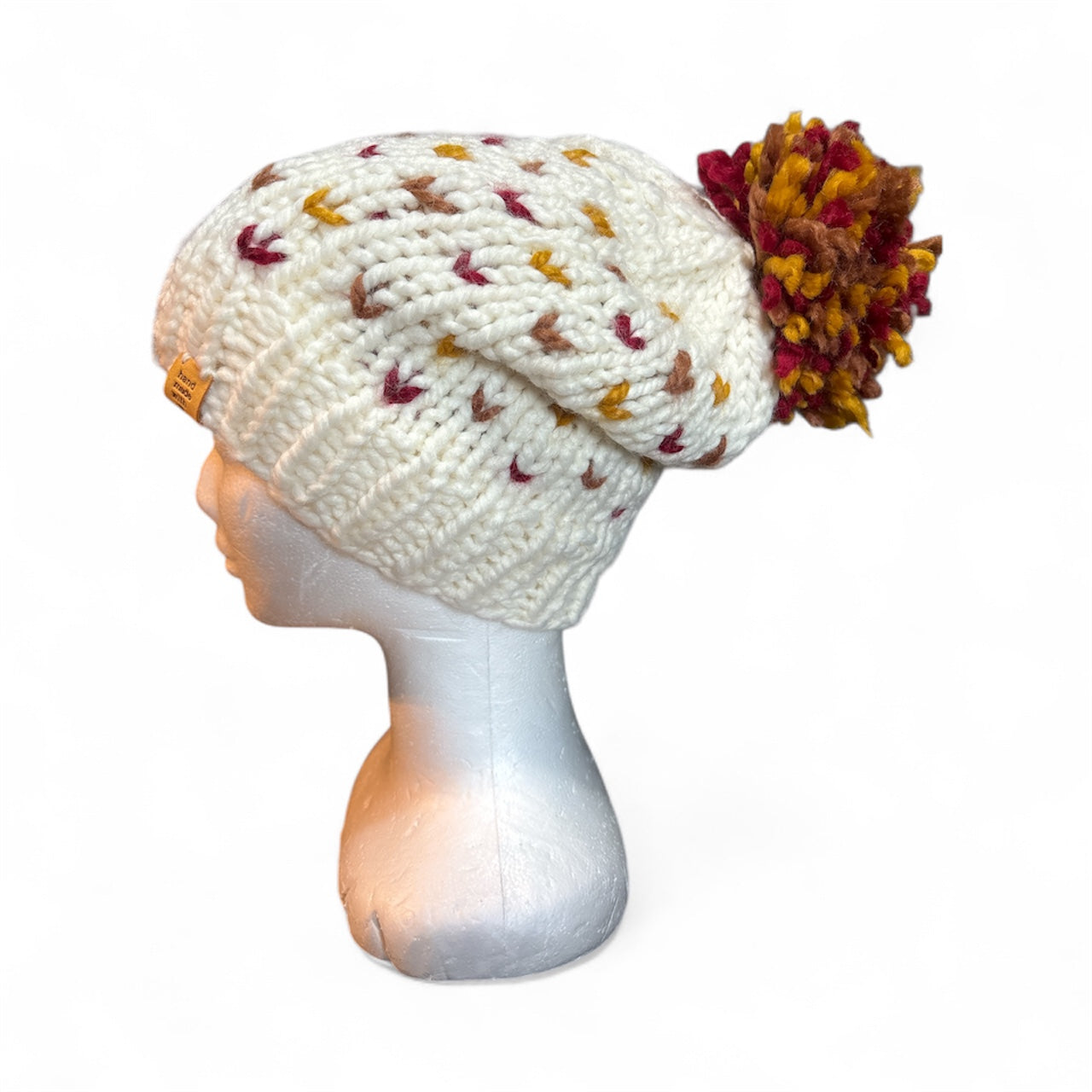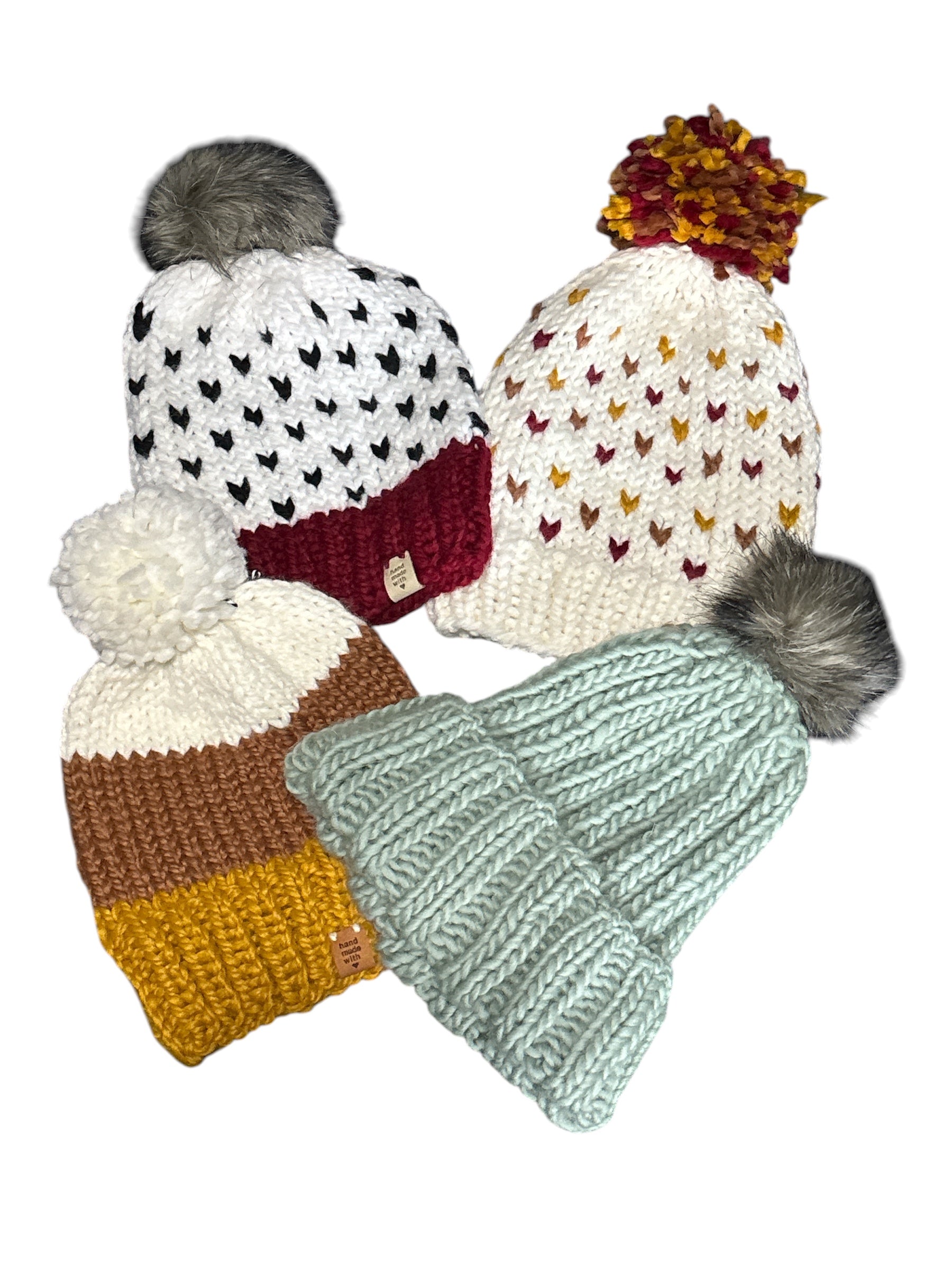 Muhkeasta paksusta villasekoitelangasta neulotut pipot. Turkis tupsut keinoturkista. Sopii päähän kuin päähän!