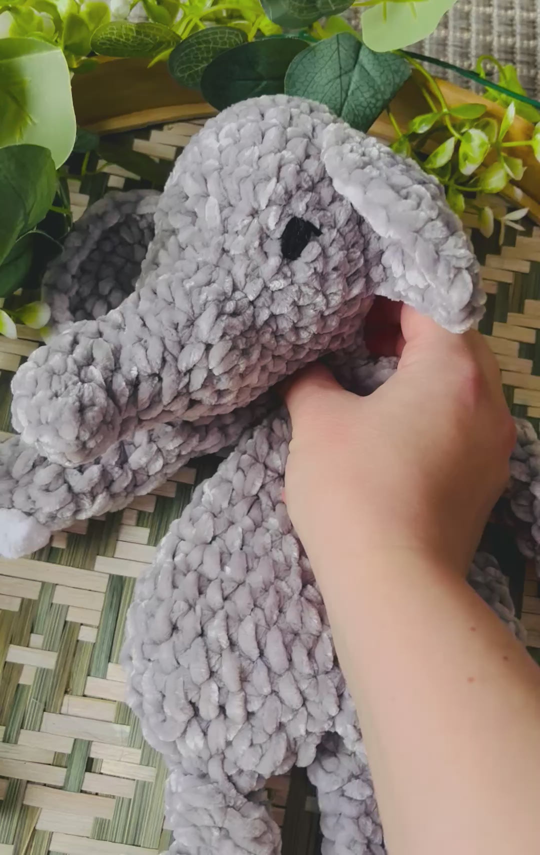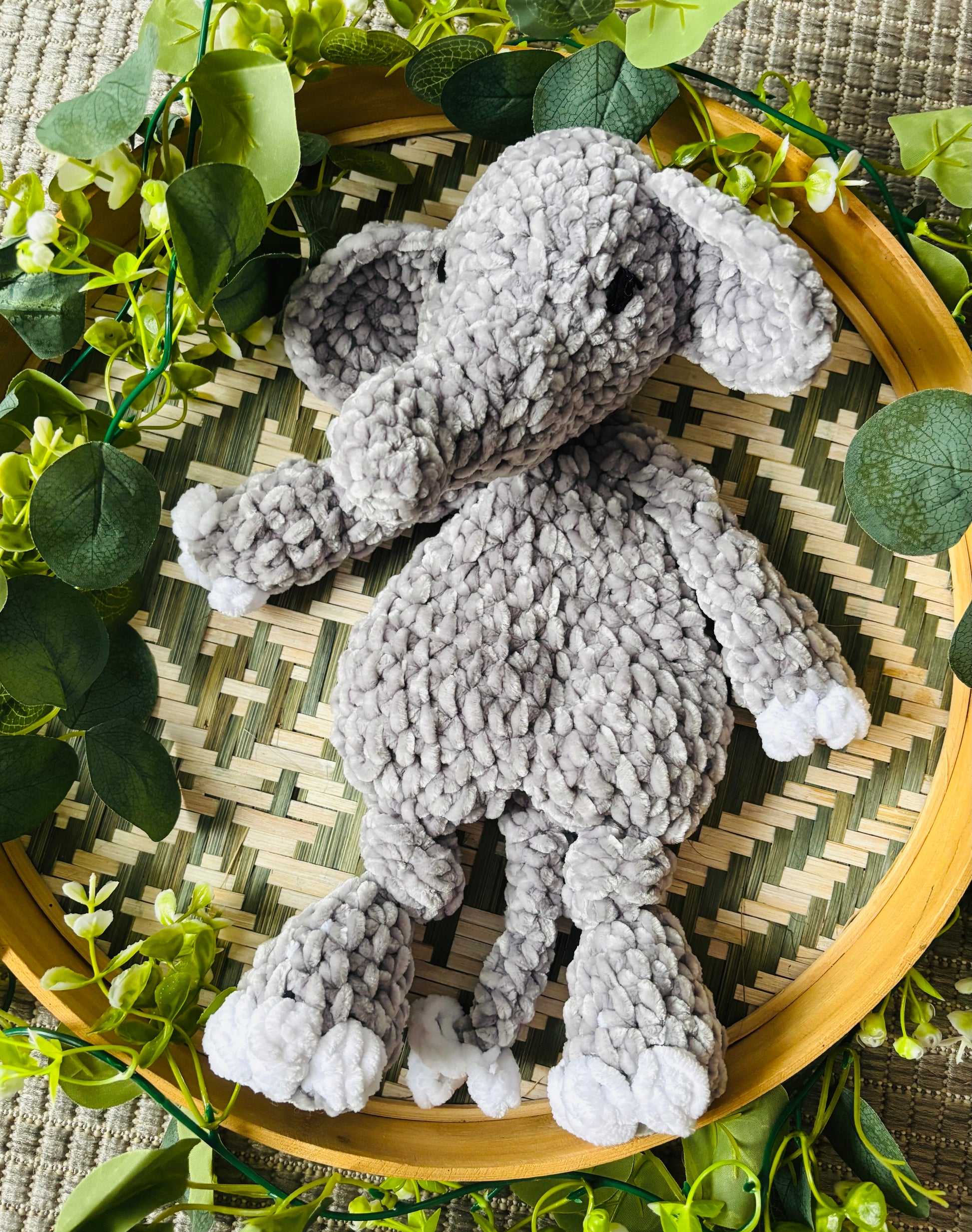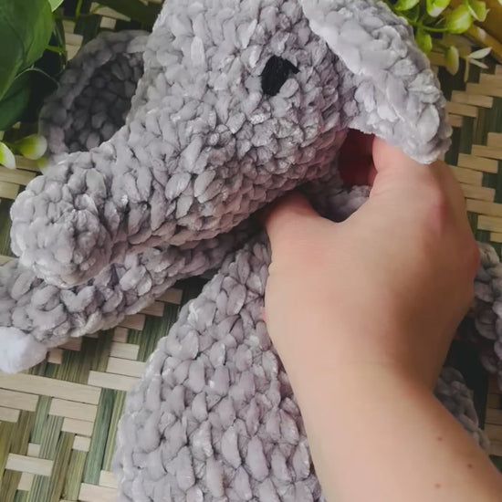 Samettilangasta virkattu pehmeä norsu. Silmät kirjailtu ja on turvallista antaa lapselle.