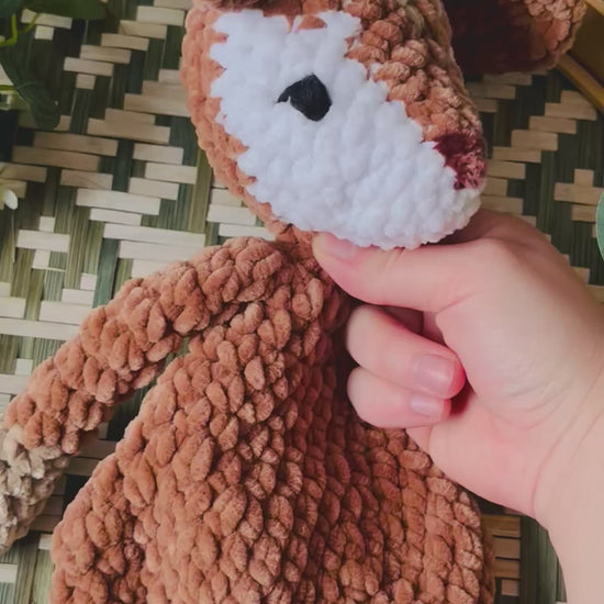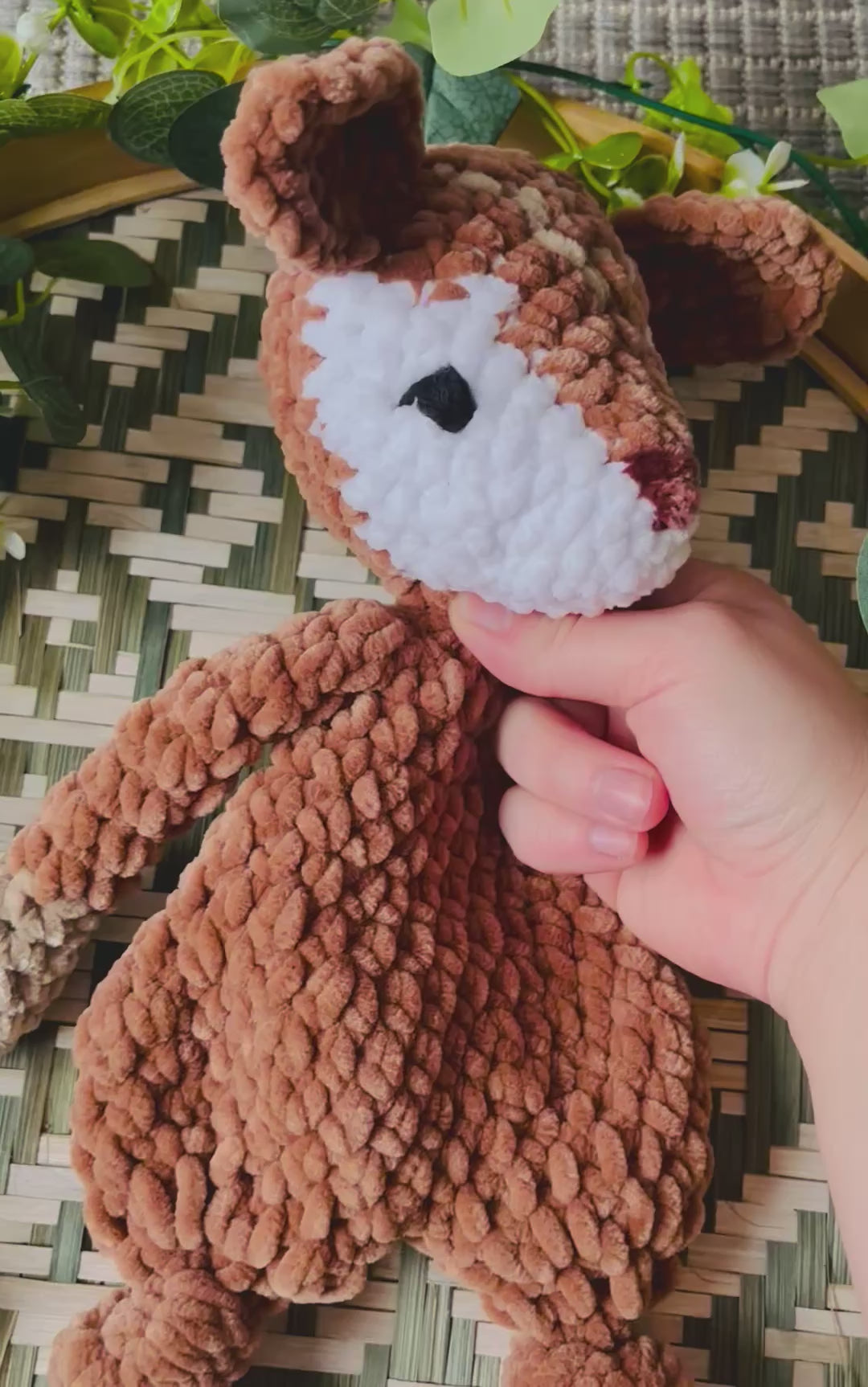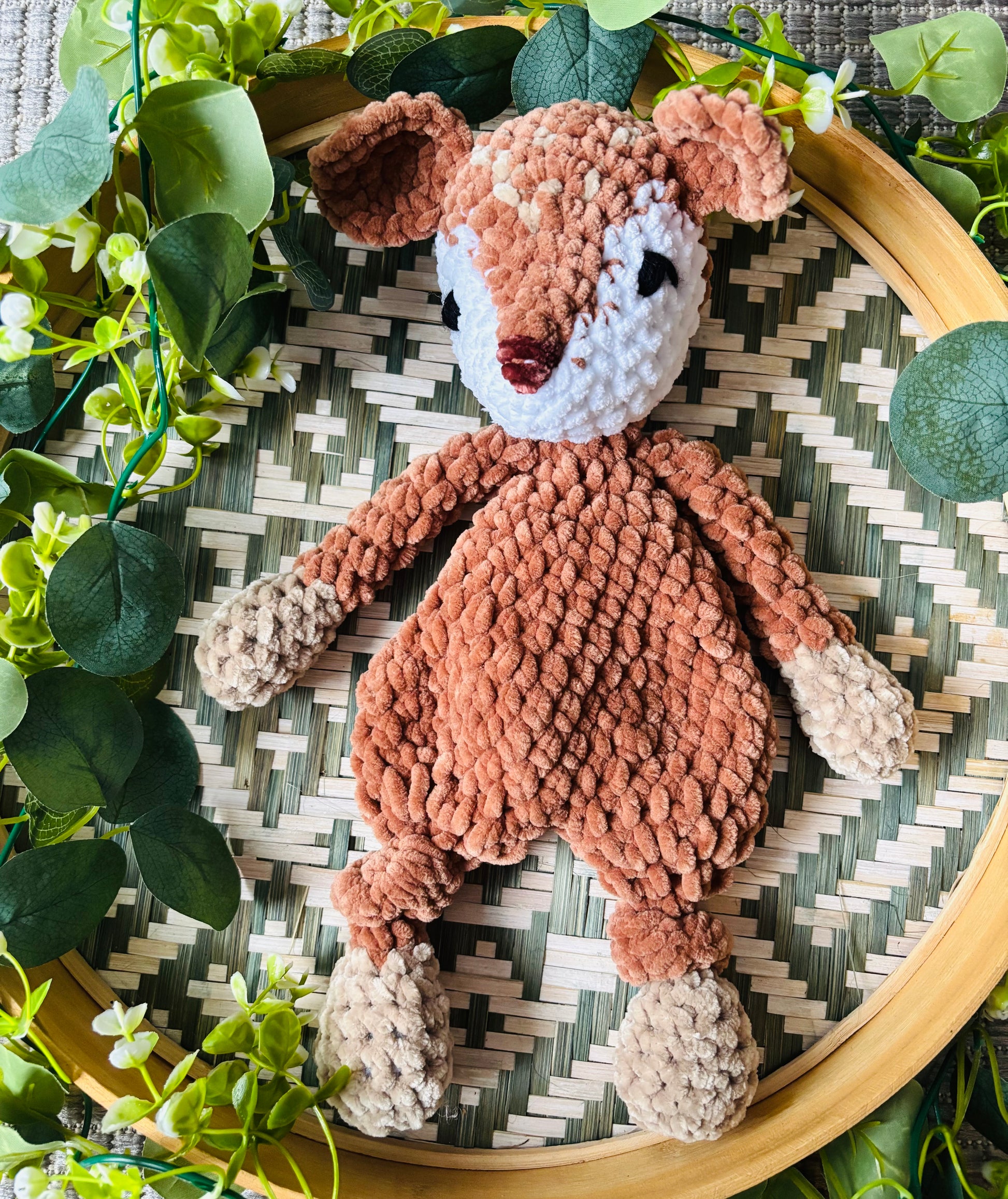 Samettilangasta virkattu pehmeä peura. Silmät kirjailtu ja on turvallista antaa lapselle.