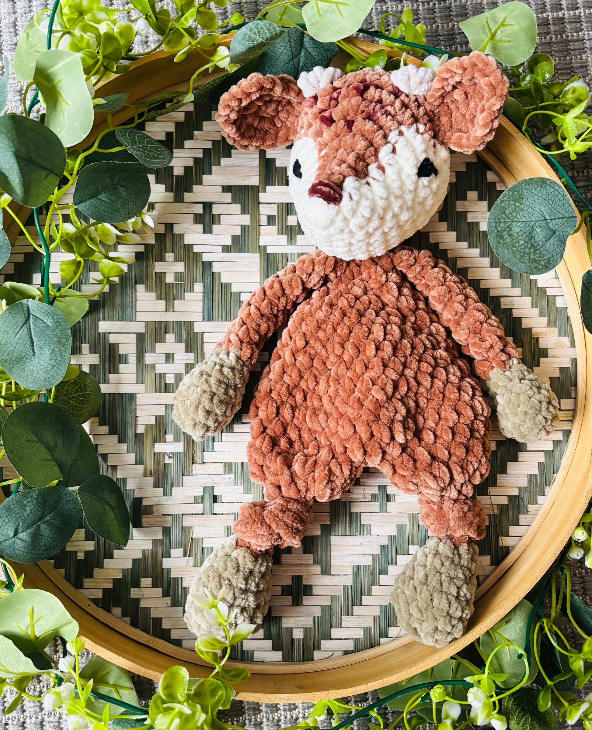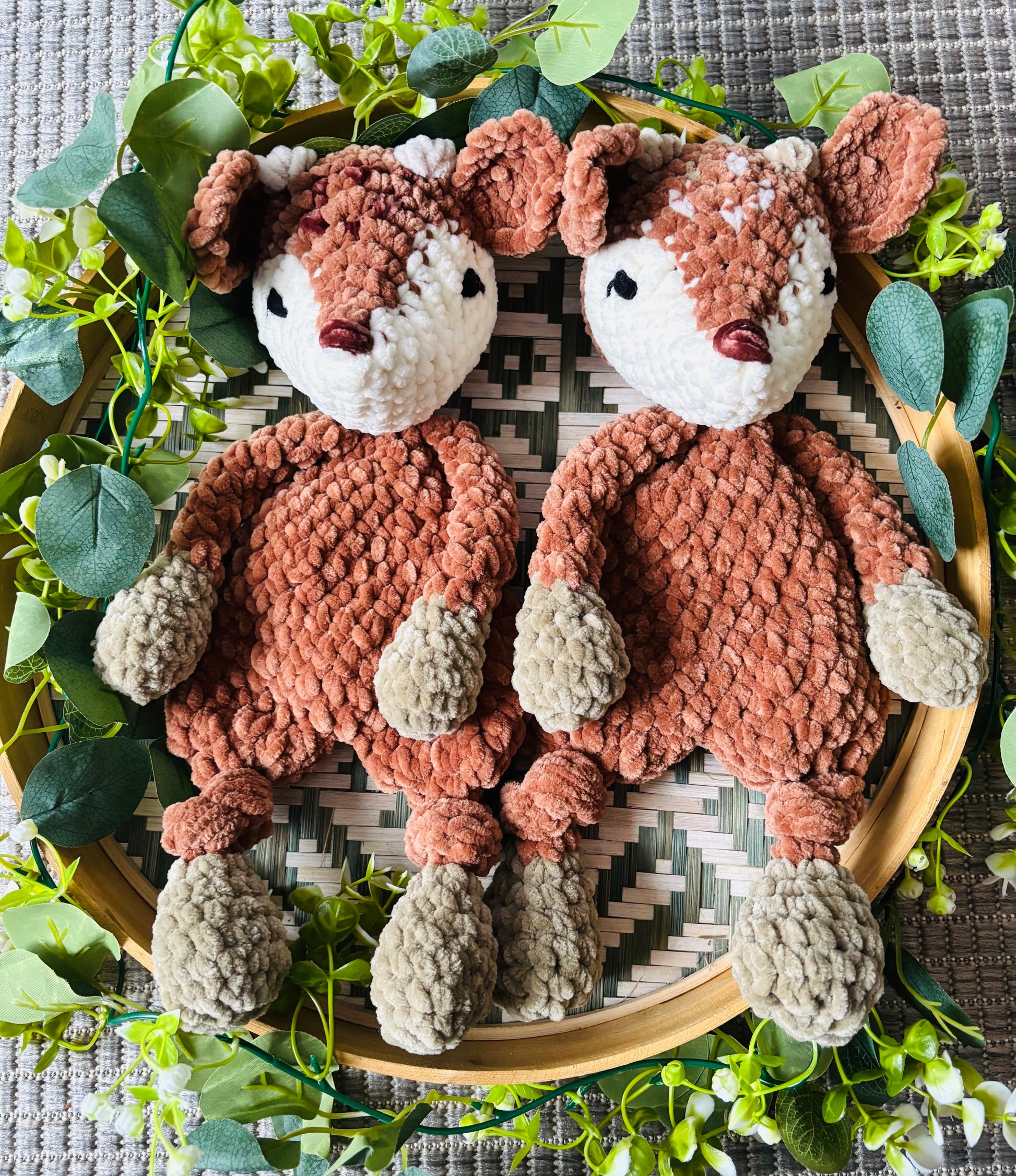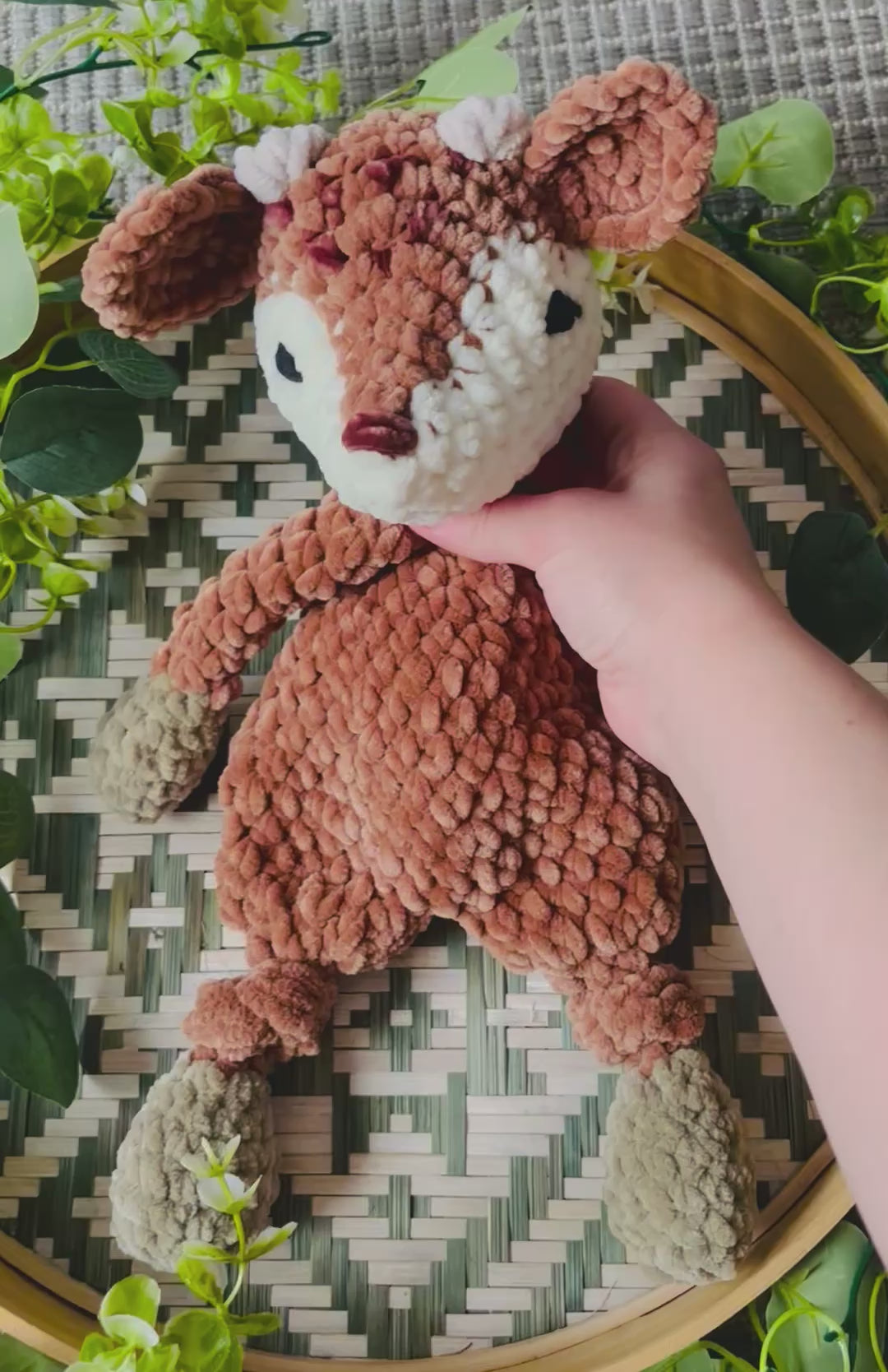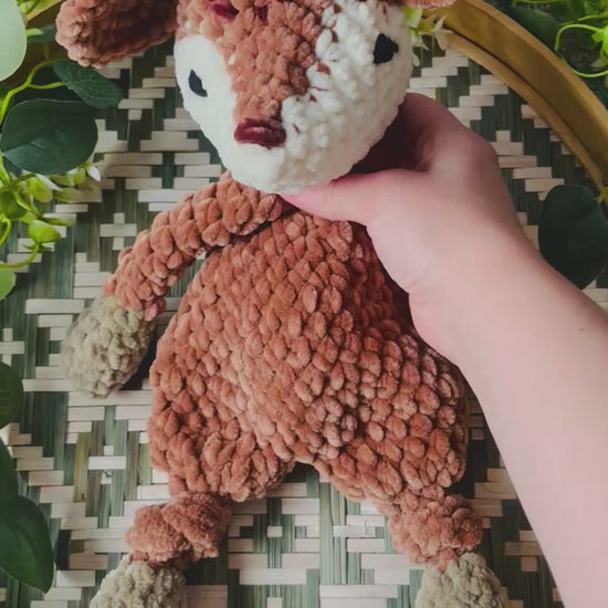 Samettilangasta virkattu pehmeä peura. Tässä peurassa pienet sarvinystyrät. Silmät kirjailtu ja on turvallista antaa lapselle.