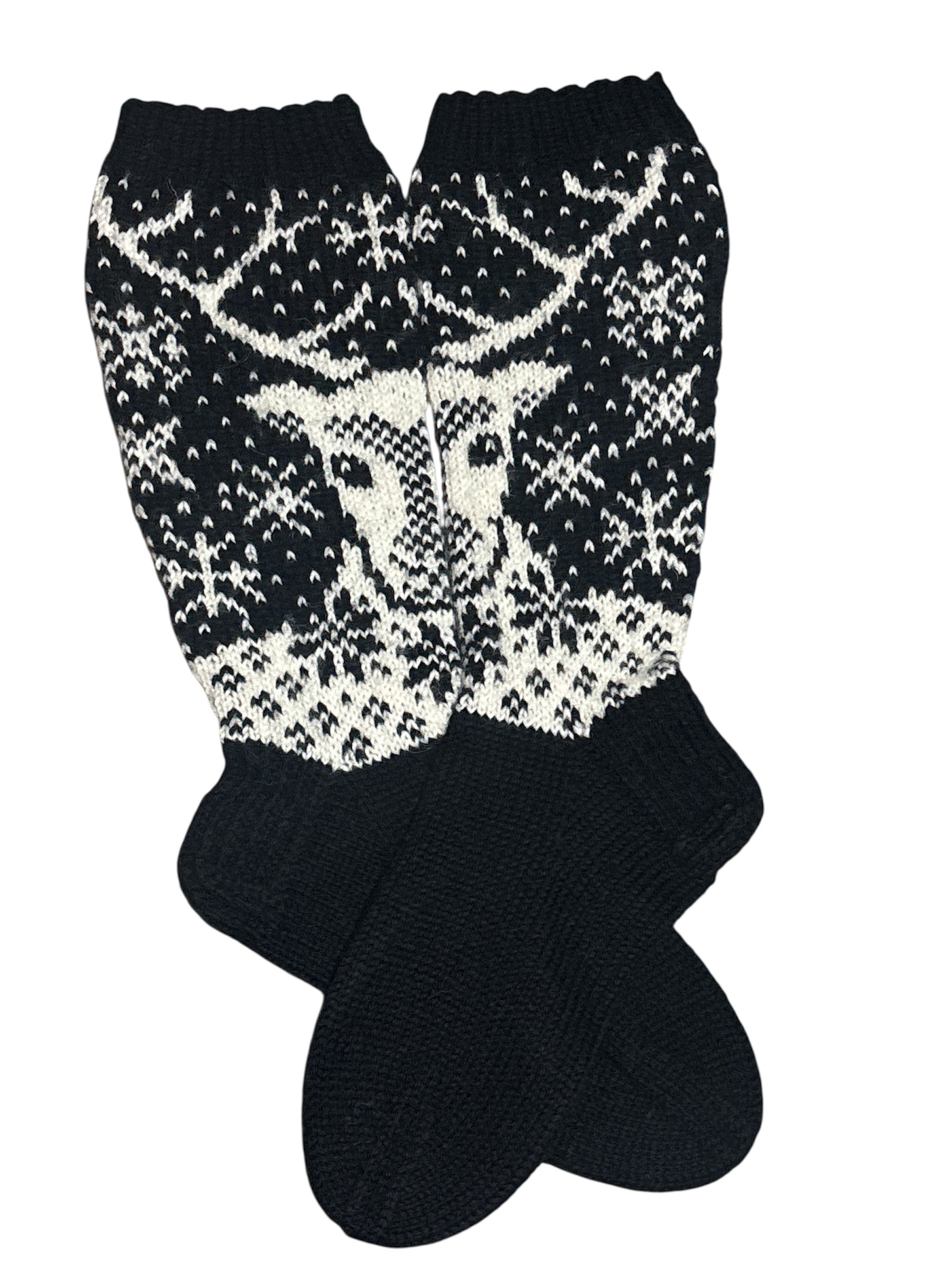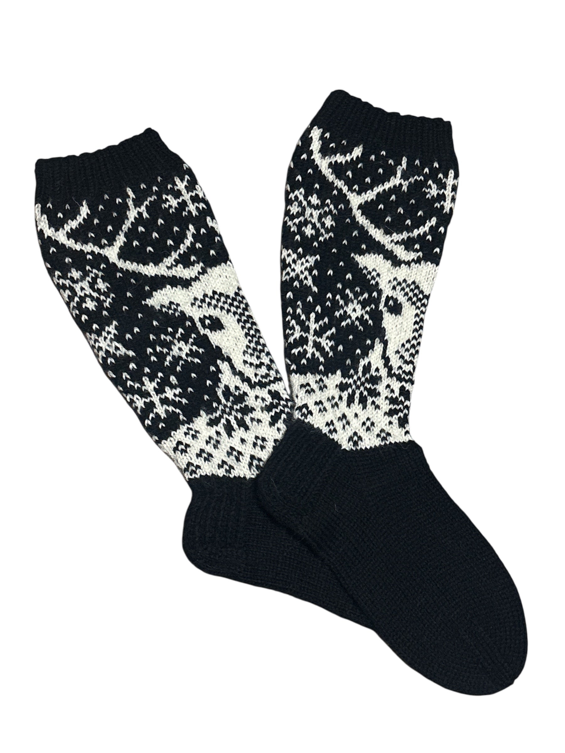Mustavalkoiset pitkät villasukat pohjepituudella. Vahvistettu kantapäät.