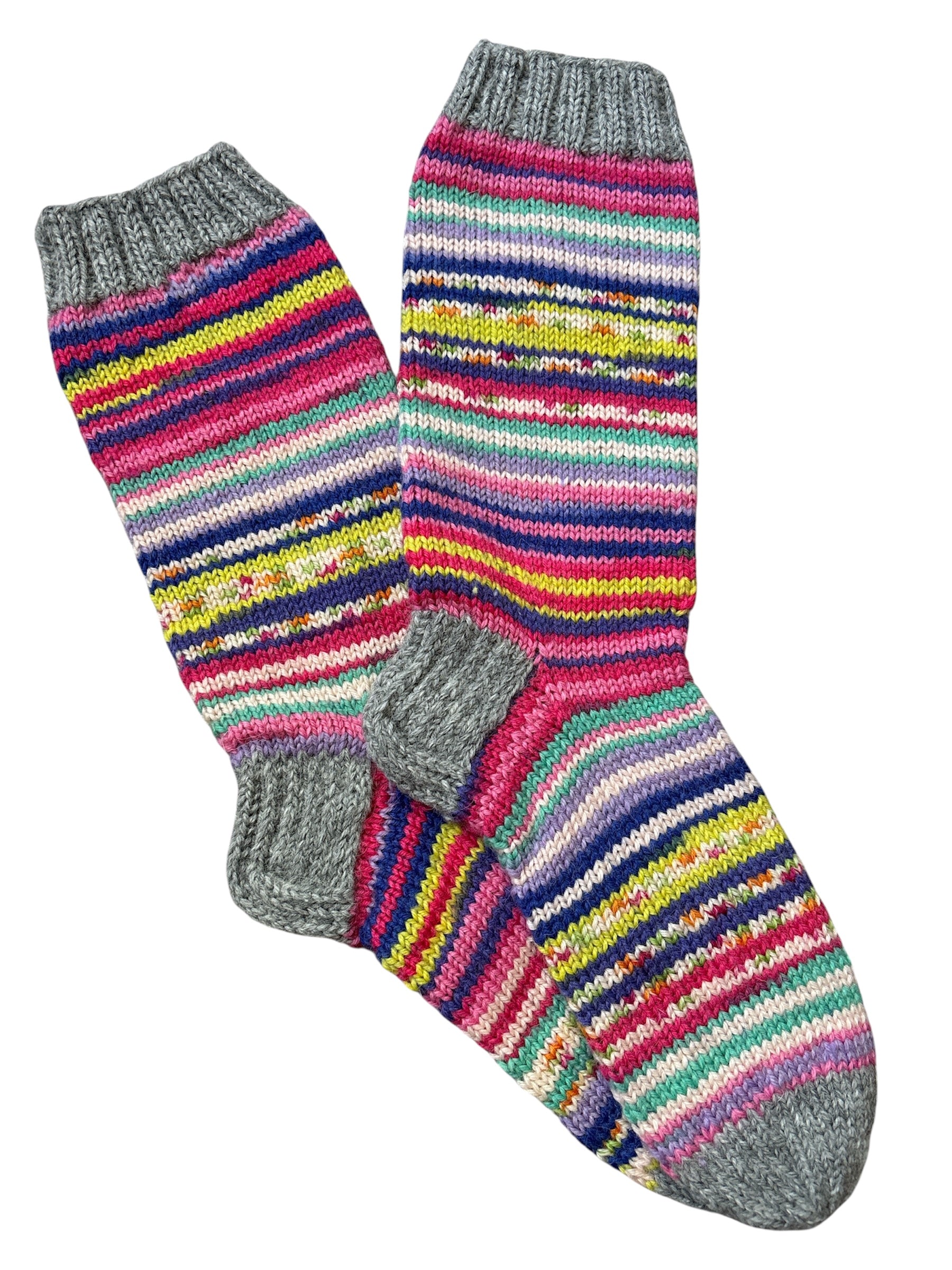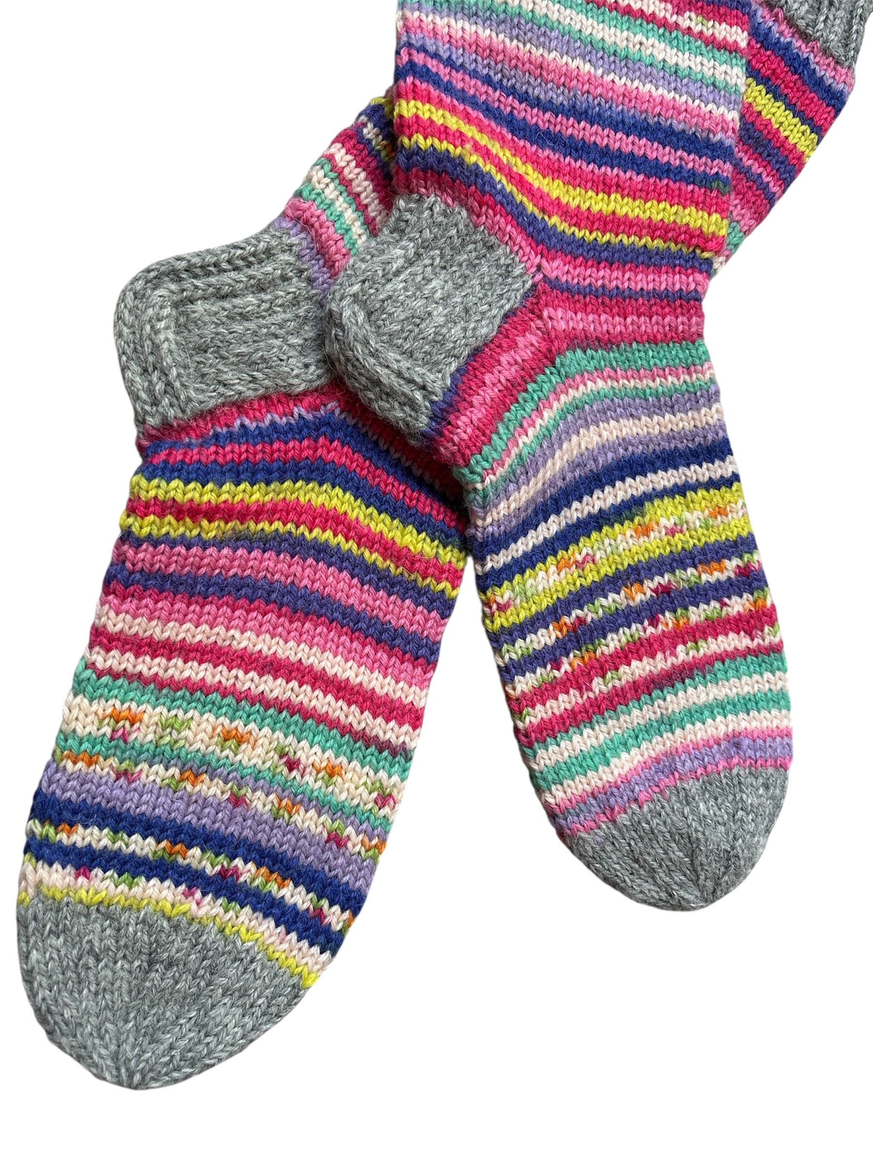 Noin pohjemittaiset raidalliset villasukat. Vahvistettu kantapää.