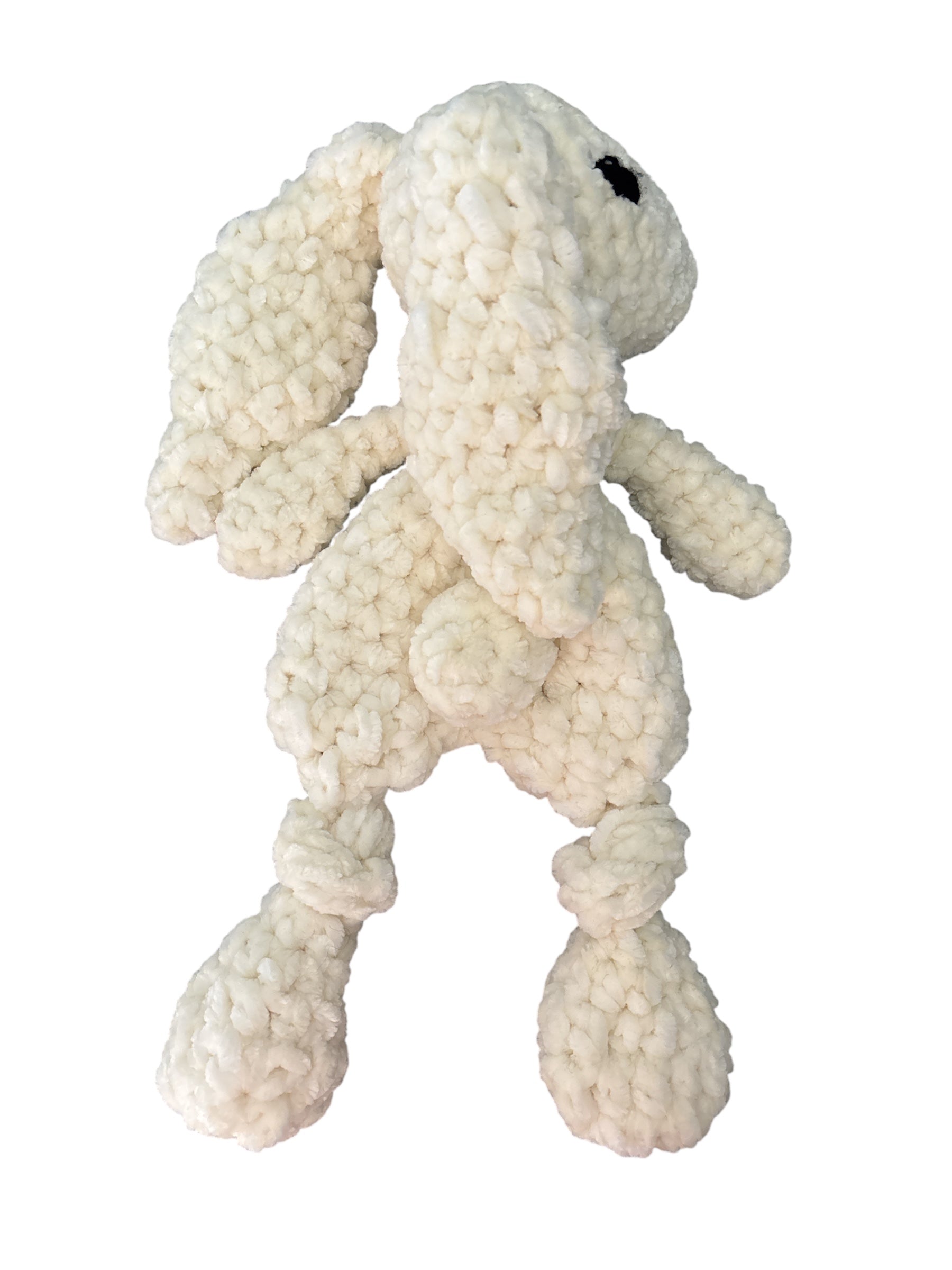 Luonnonvalkoisesta samettilangasta virkattu pehmeä pupu.