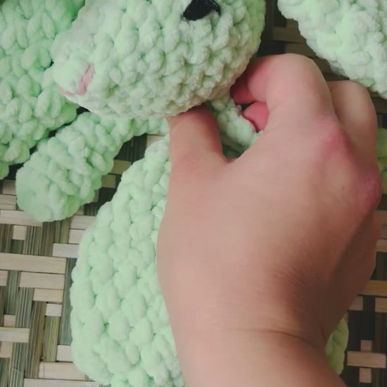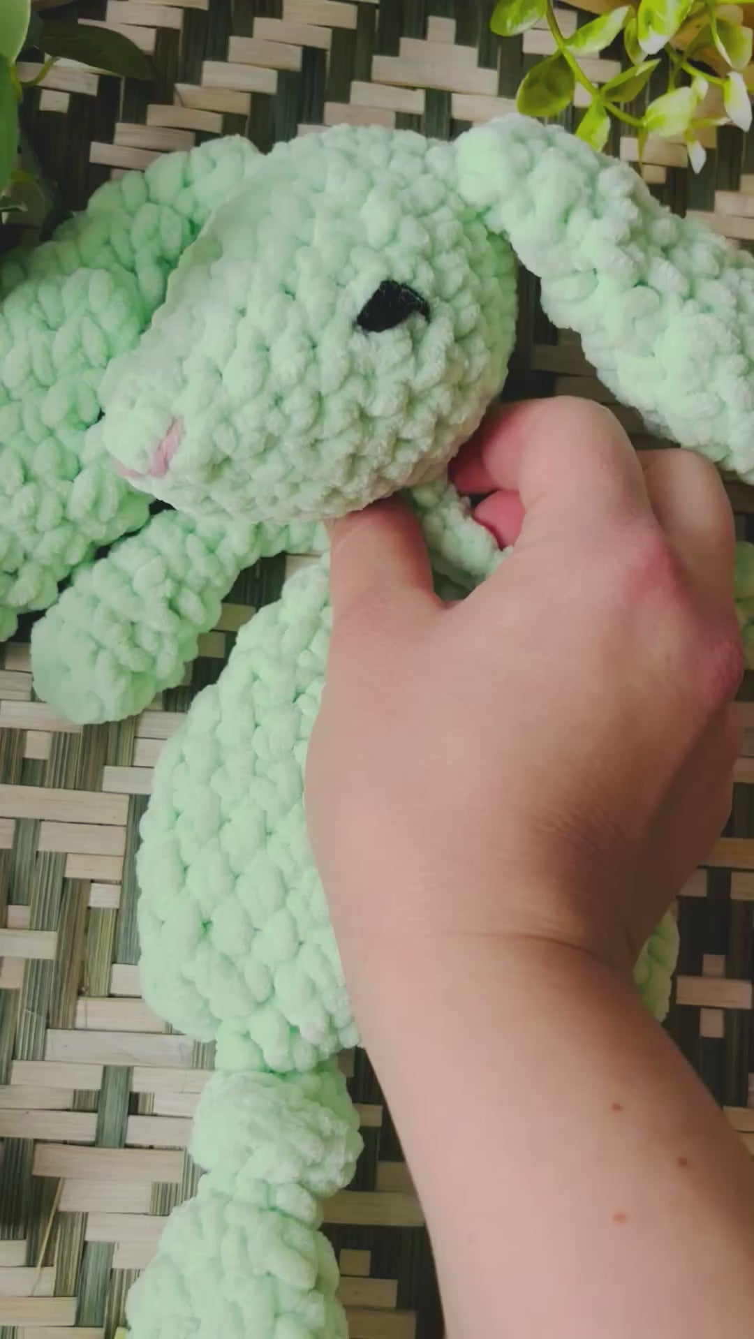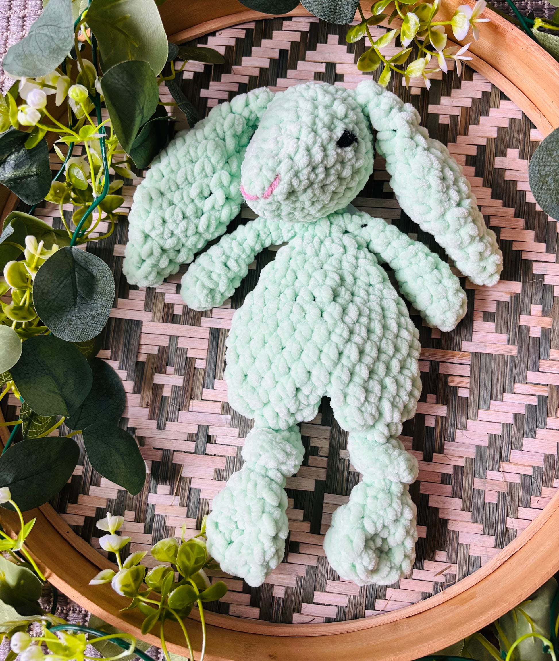 Samettilangasta virkattu pehmeä pupu. Silmät kirjailtu ja on turvallista antaa lapselle.