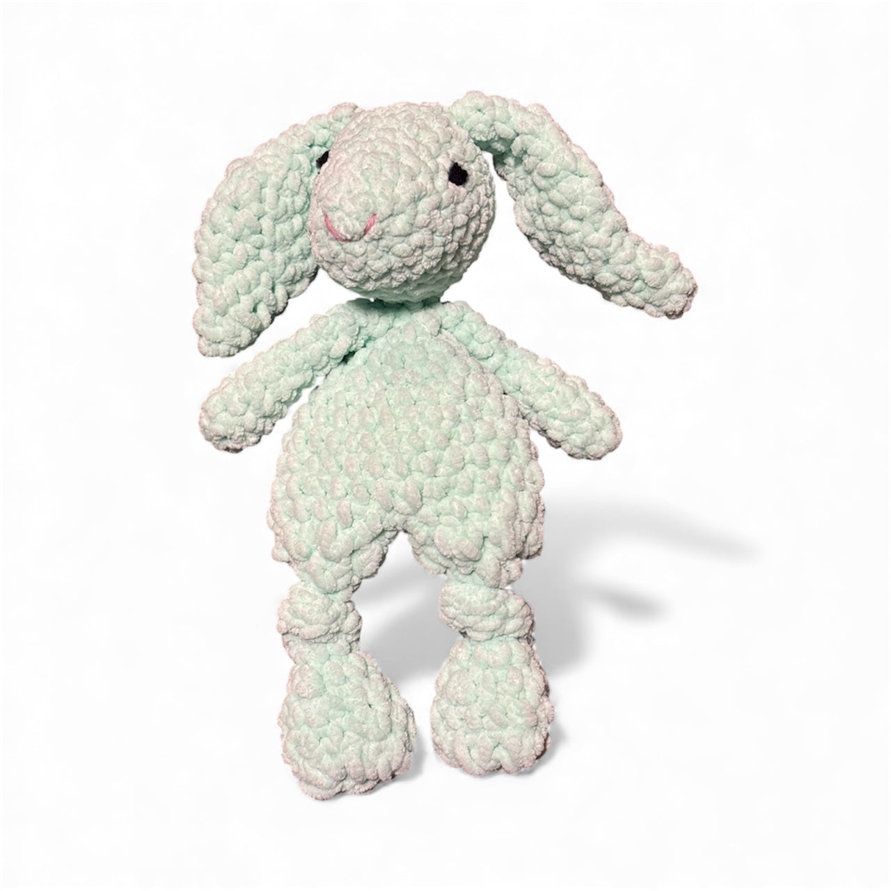 Pehmeästä mintun sävyisestä samettilangasta virkattu pupu.