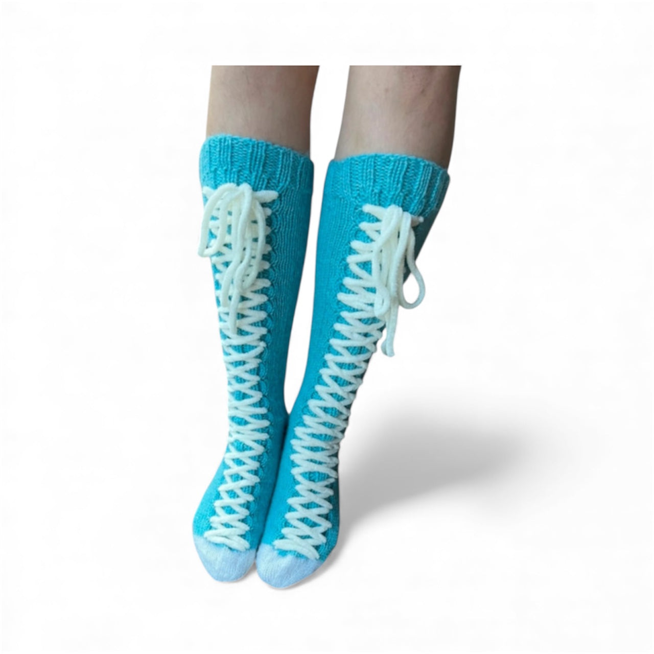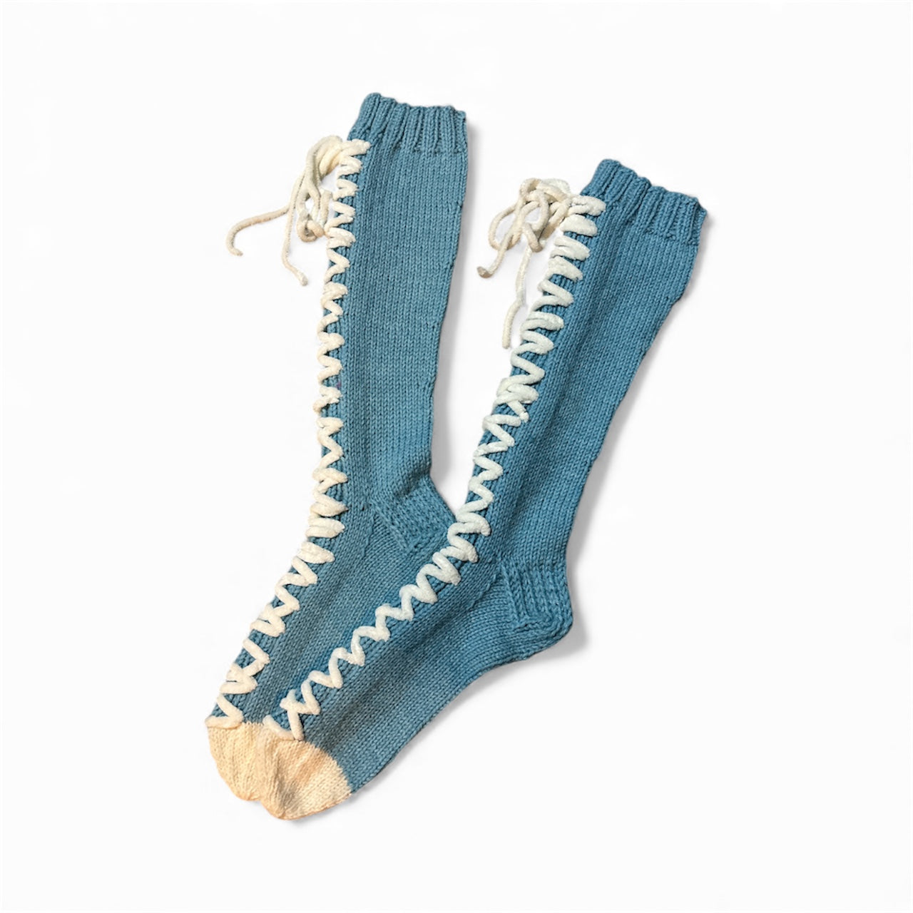 Pitkävartiset tennarimakset villasukat. Vahvistettu kantapää. Samettilangasta nauhat.