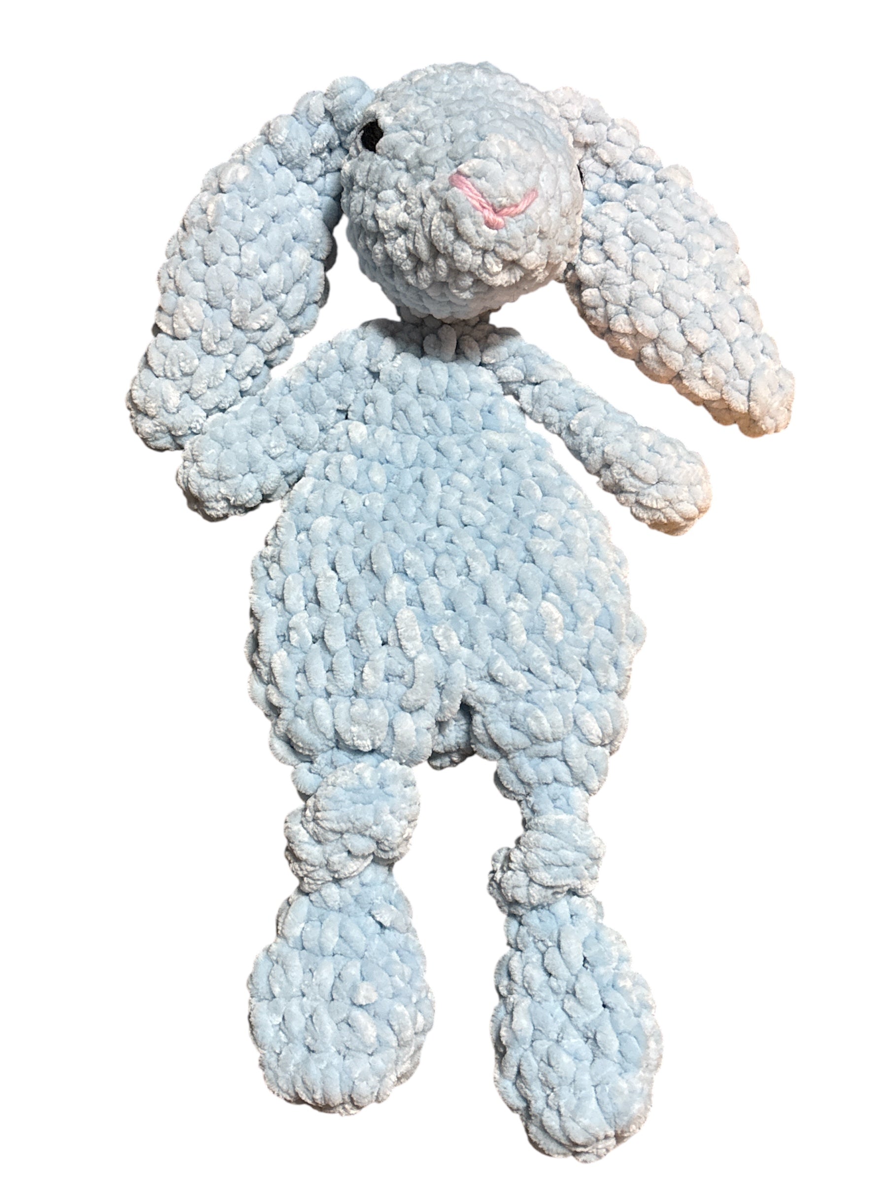 Pehmeästä vaaleansinisen sävyisestä samettilangasta virkattu pupu.